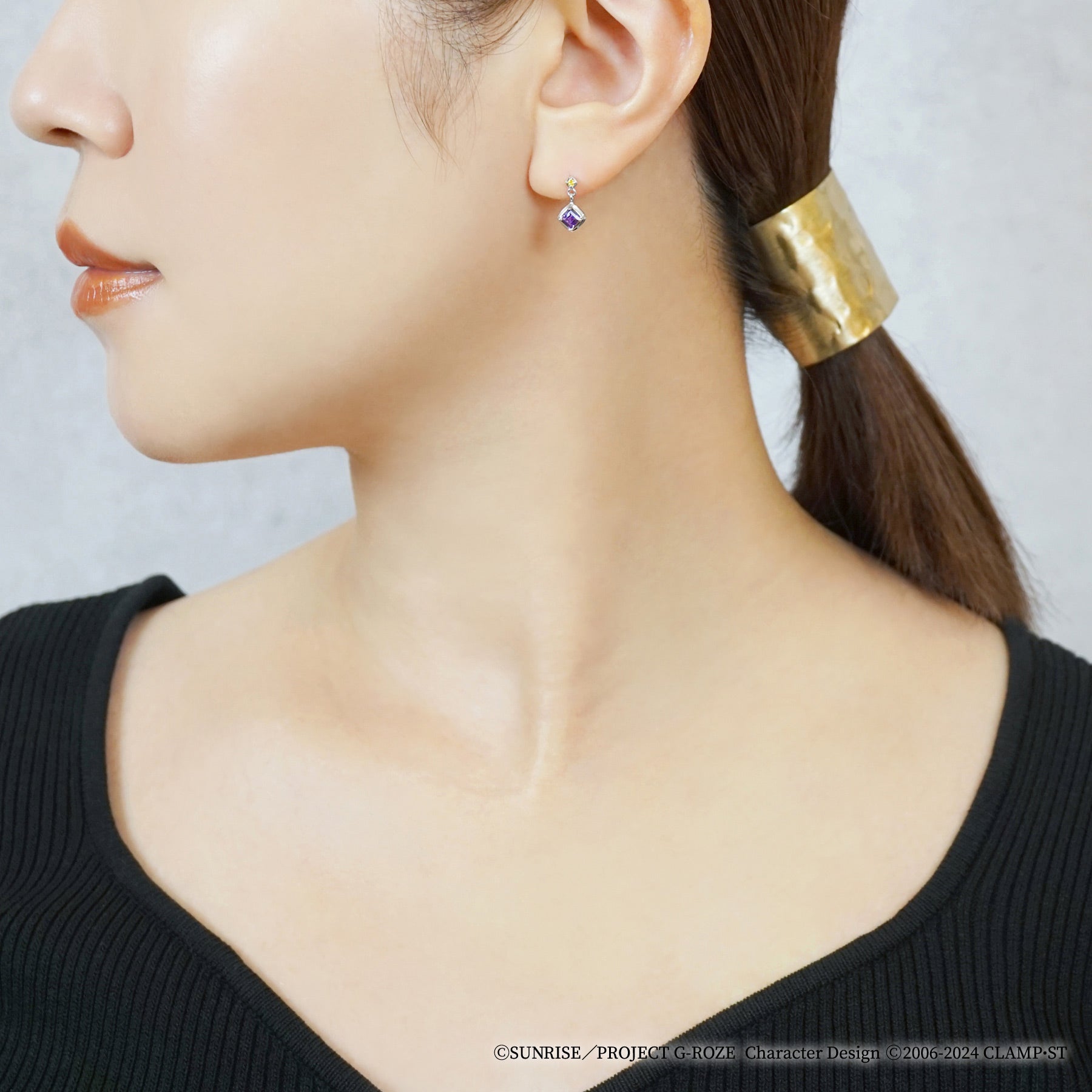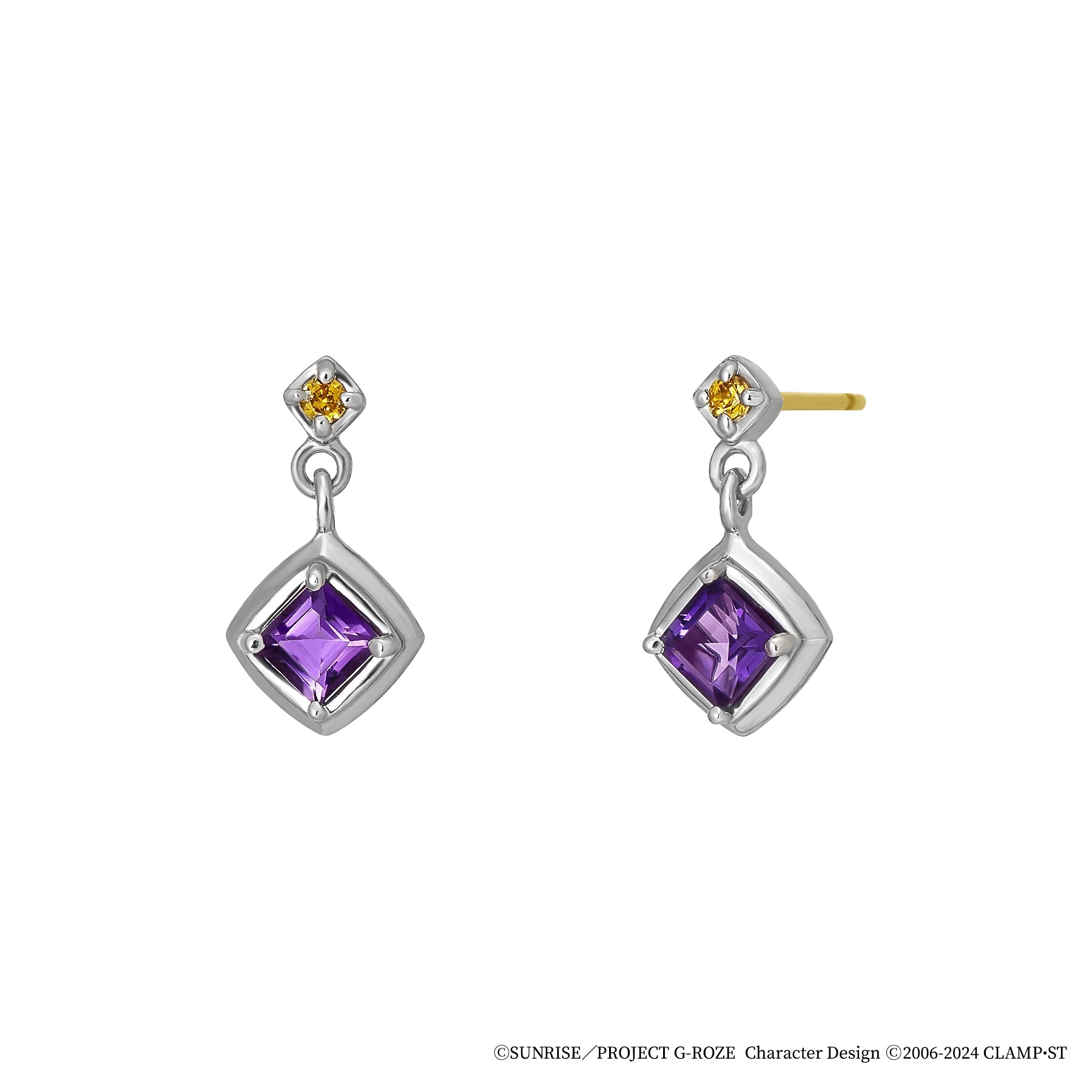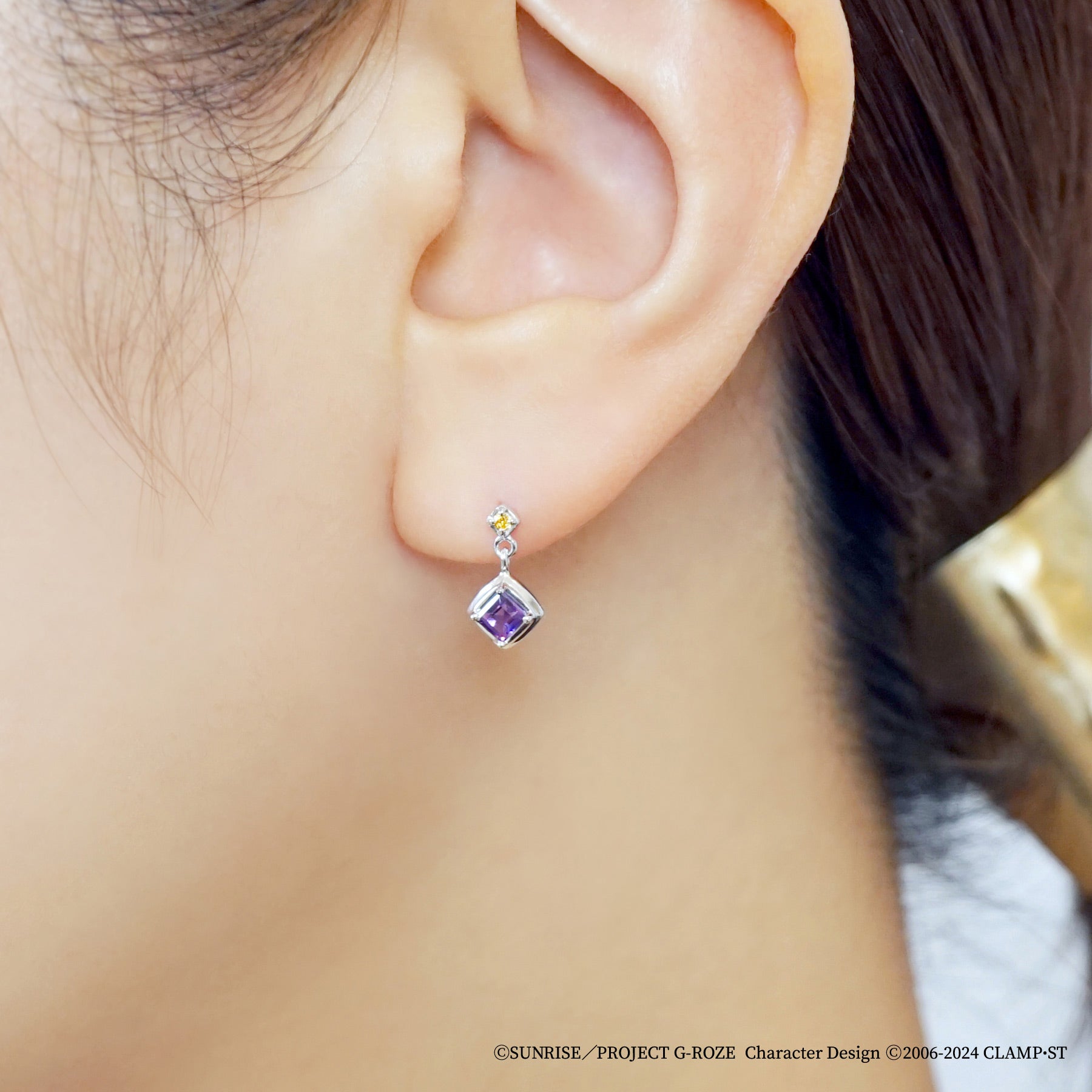 ロゼをイメージしたピアス。ロゼの髪色のキュービックジルコニアの下で揺れる、菱形のアメジストを留めた石座の裏にはギアスマークが浮かびます。首輪をモチーフにしたデザインは細部にまでこだわり、シャープながらも柔らかな印象になるようにこだわりました。