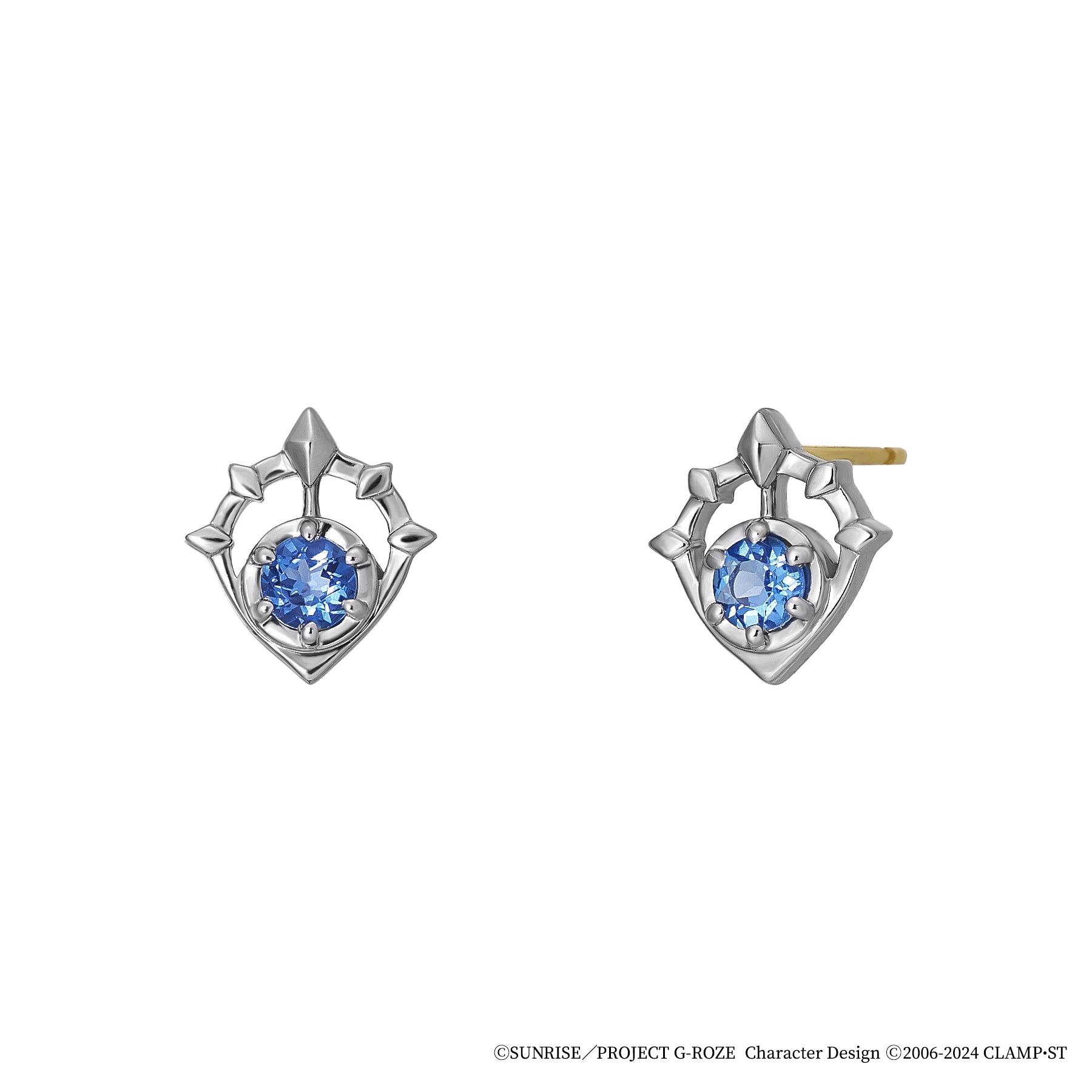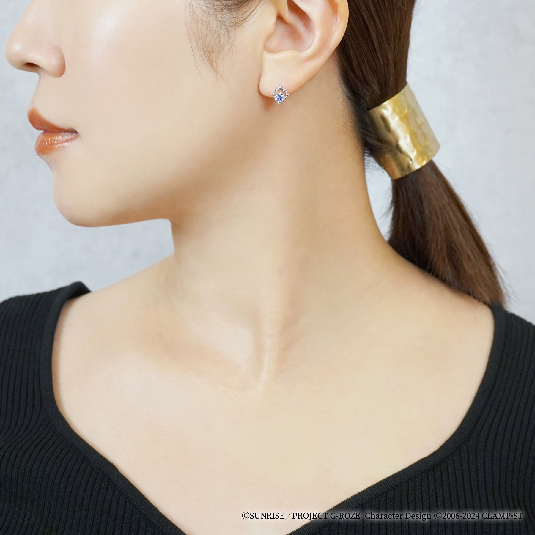 アッシュをイメージしたピアス。アッシュが搭乗するナイトメアフレーム「Zi-アポロ」のモチーフから落とし込み、ひとつひとつの菱形の立体感の細部までこだわりました。中心にはアッシュの髪色をイメージした優しく涼しげなカラーのブルークォーツをあしらいました。