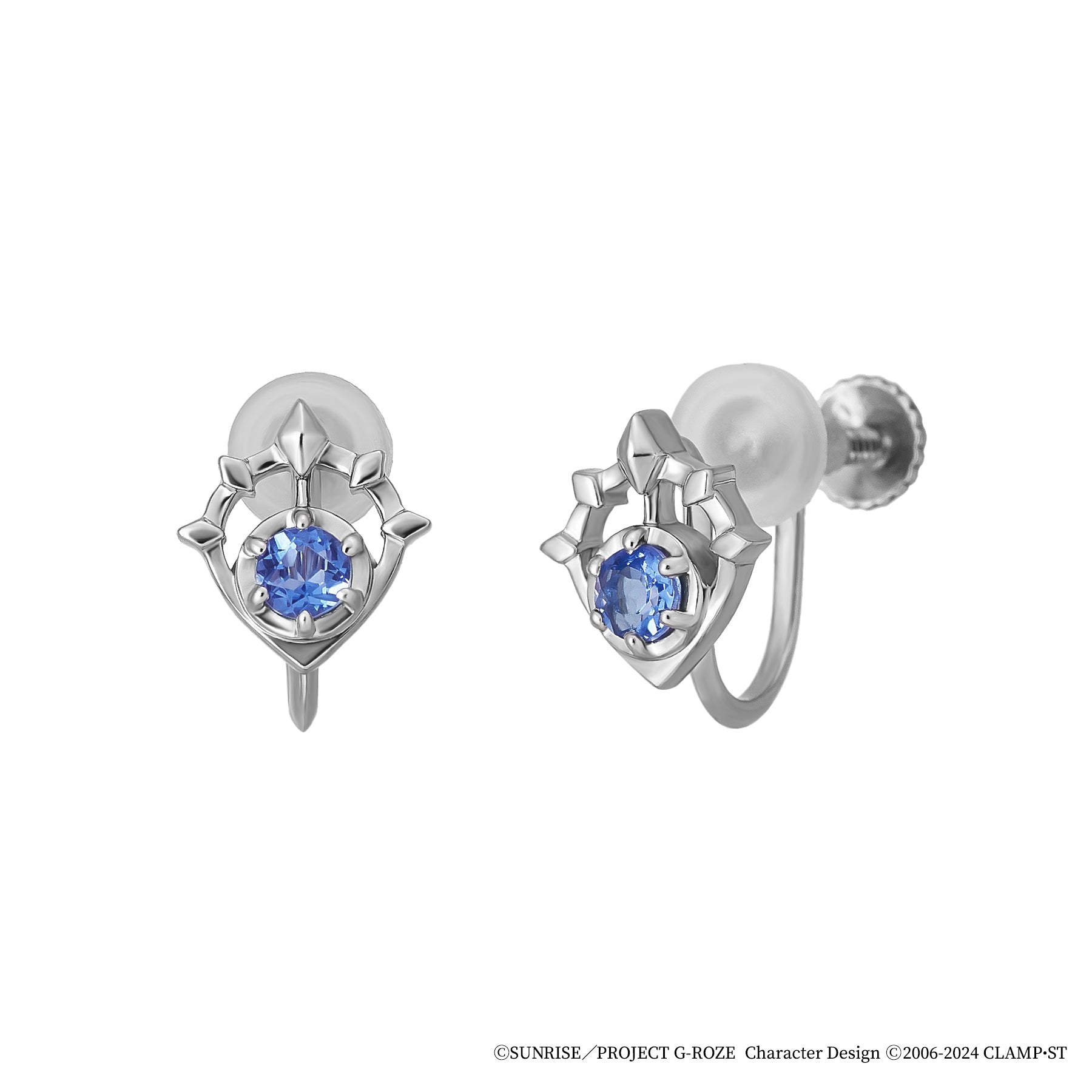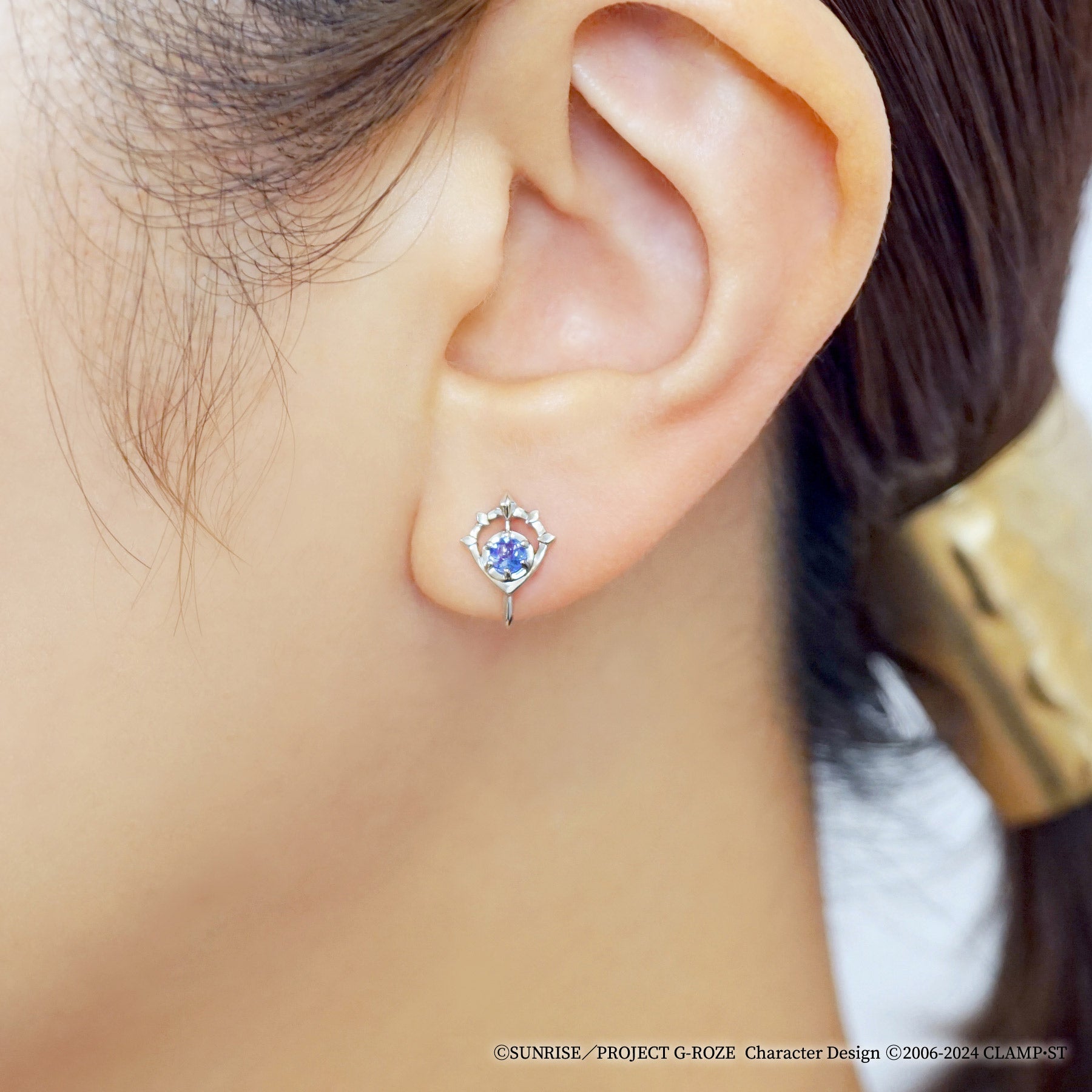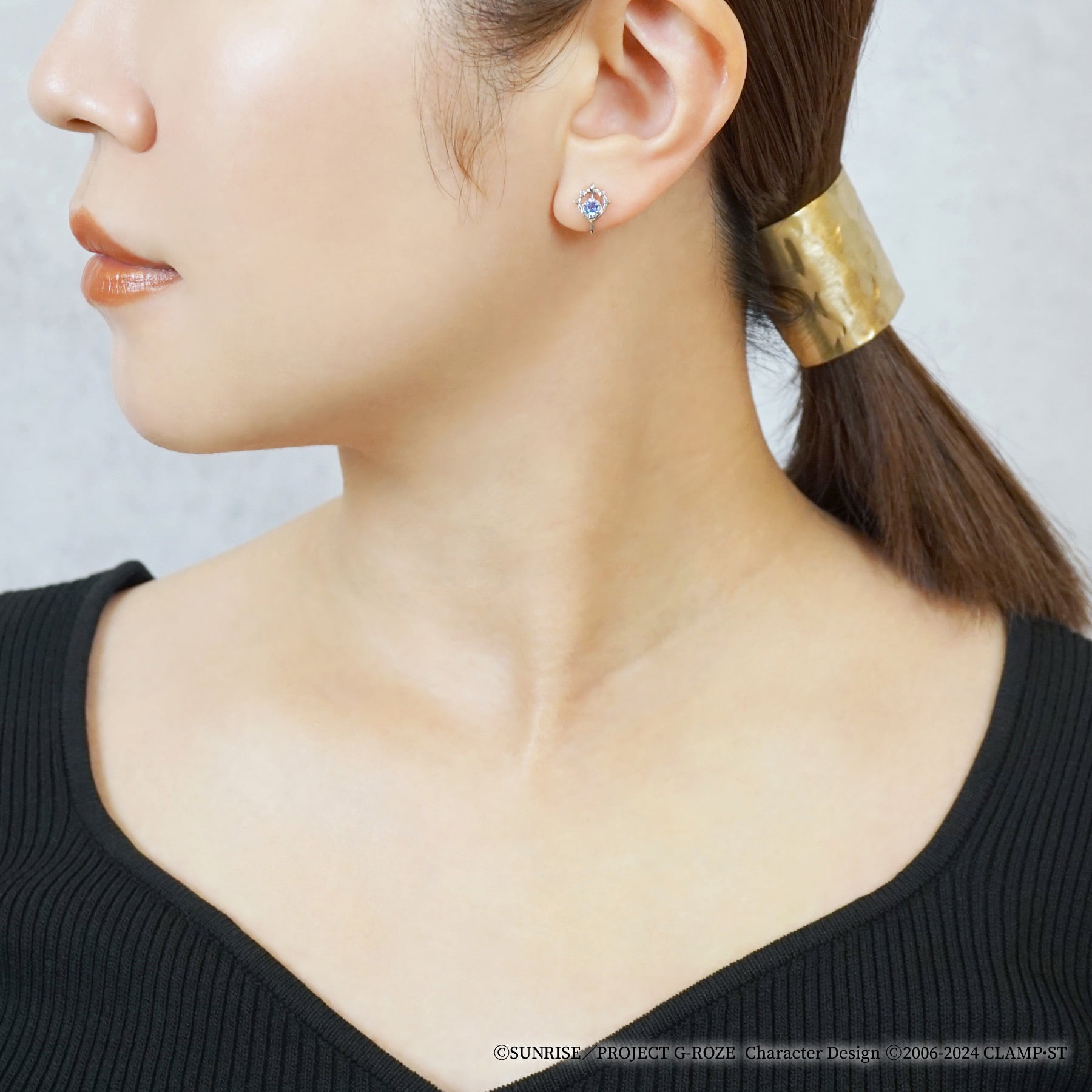 アッシュをイメージしたイヤリング。アッシュが搭乗するナイトメアフレーム「Zi-アポロ」のモチーフから落とし込み、ひとつひとつの菱形の立体感の細部までこだわりました。中心にはアッシュの髪色をイメージした優しく涼しげなカラーのブルークォーツをあしらいました。