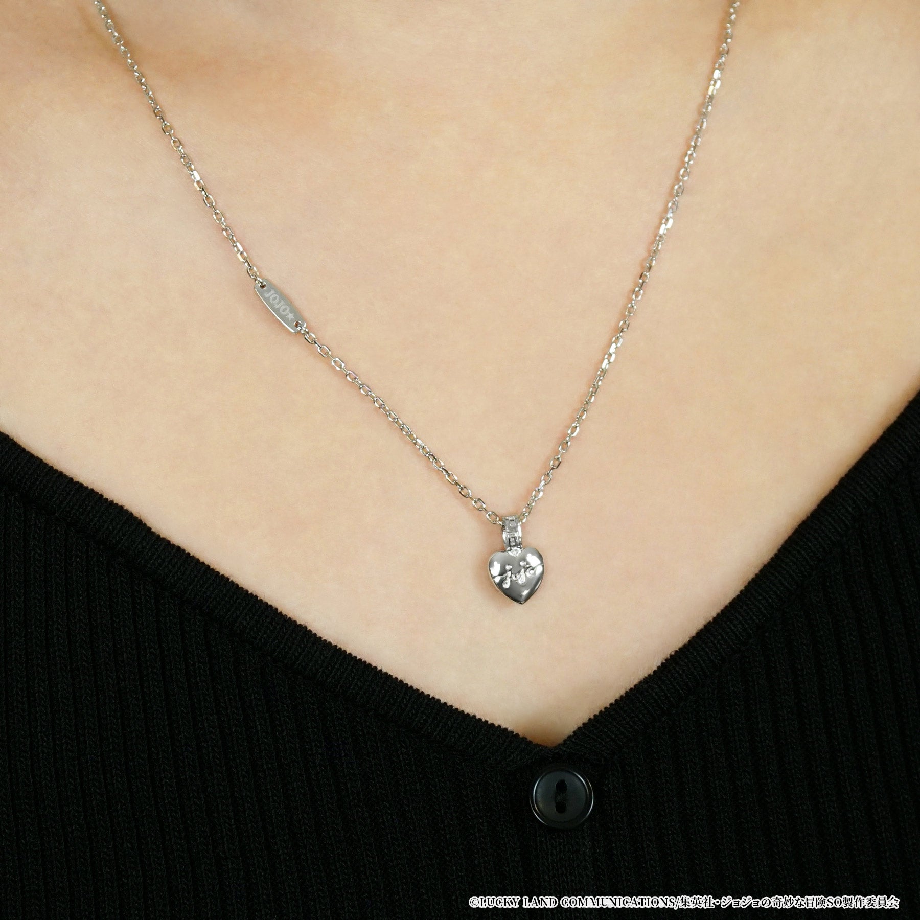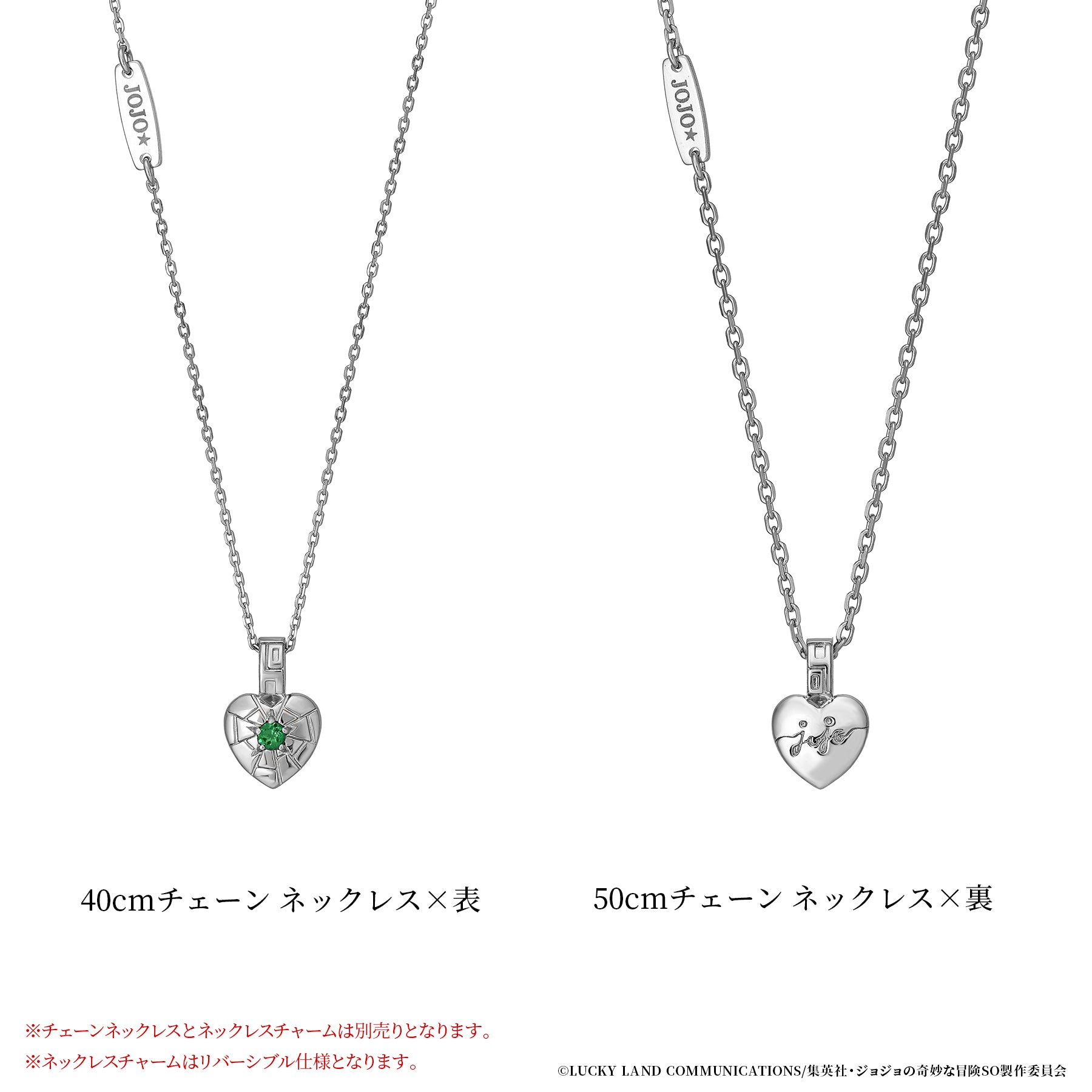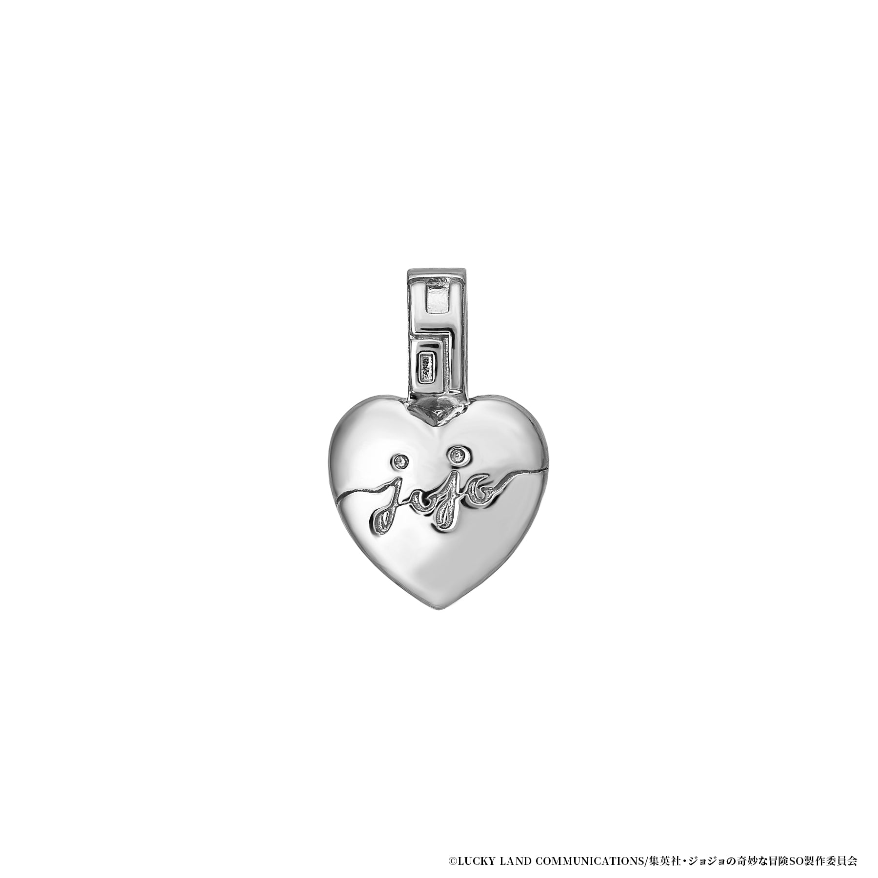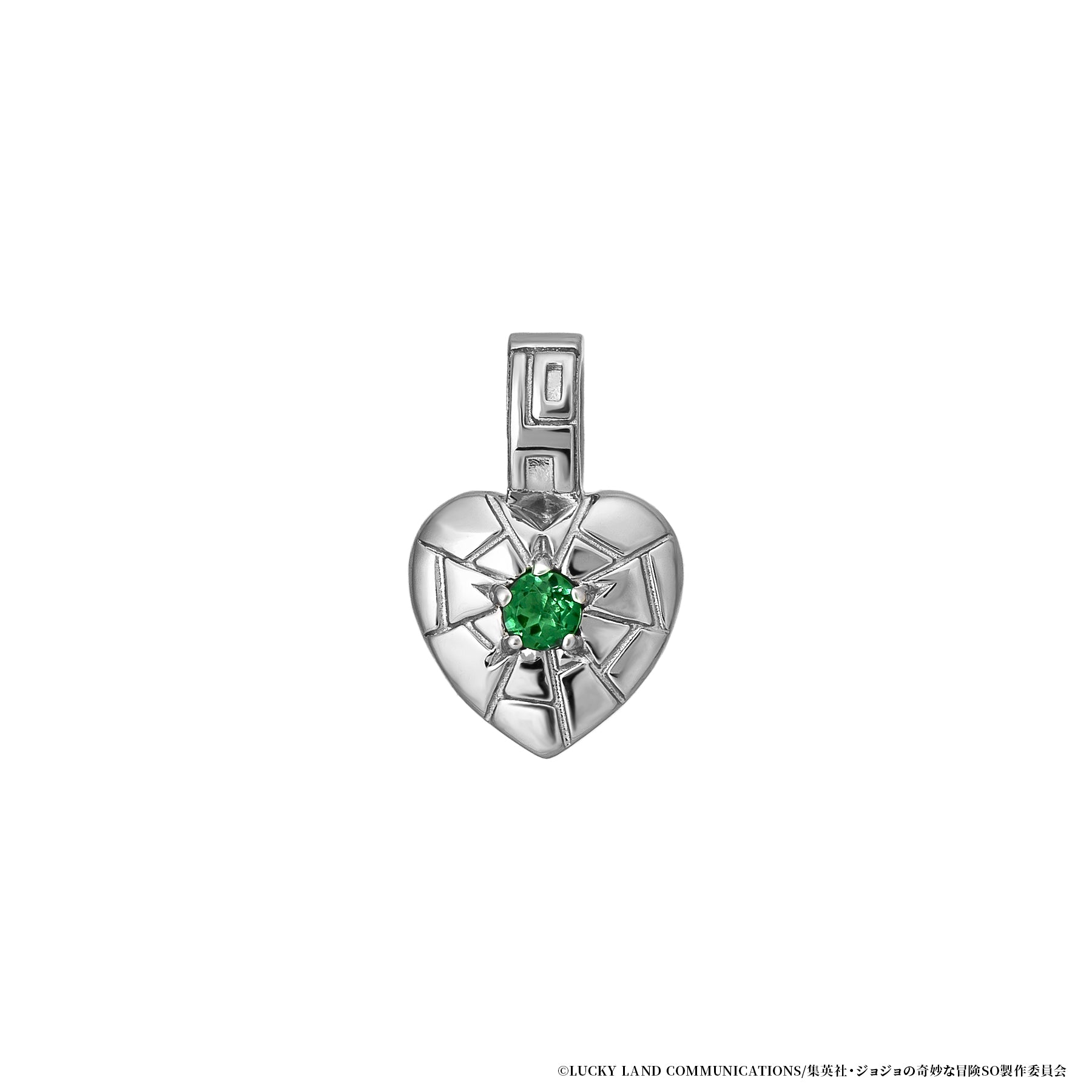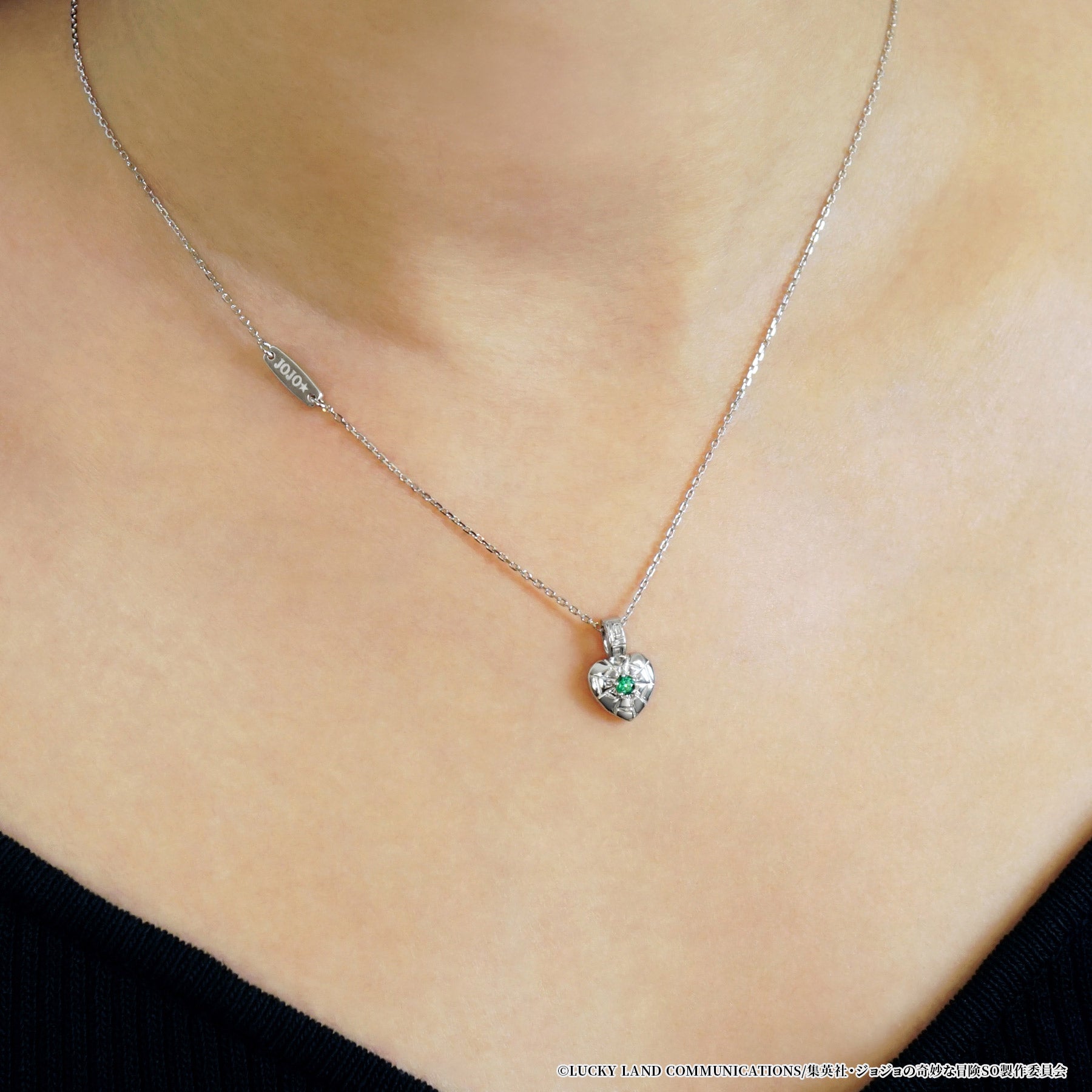 中央には空条徐倫の瞳のカラーをイメージした鮮やかなグリーンクォーツをセッティング。胸元のハートデザインに星の痣やスタンドの糸を取り入れデザインしました。裏側は愛称の『JOJO』を糸で描いたイメージで仕上げています。