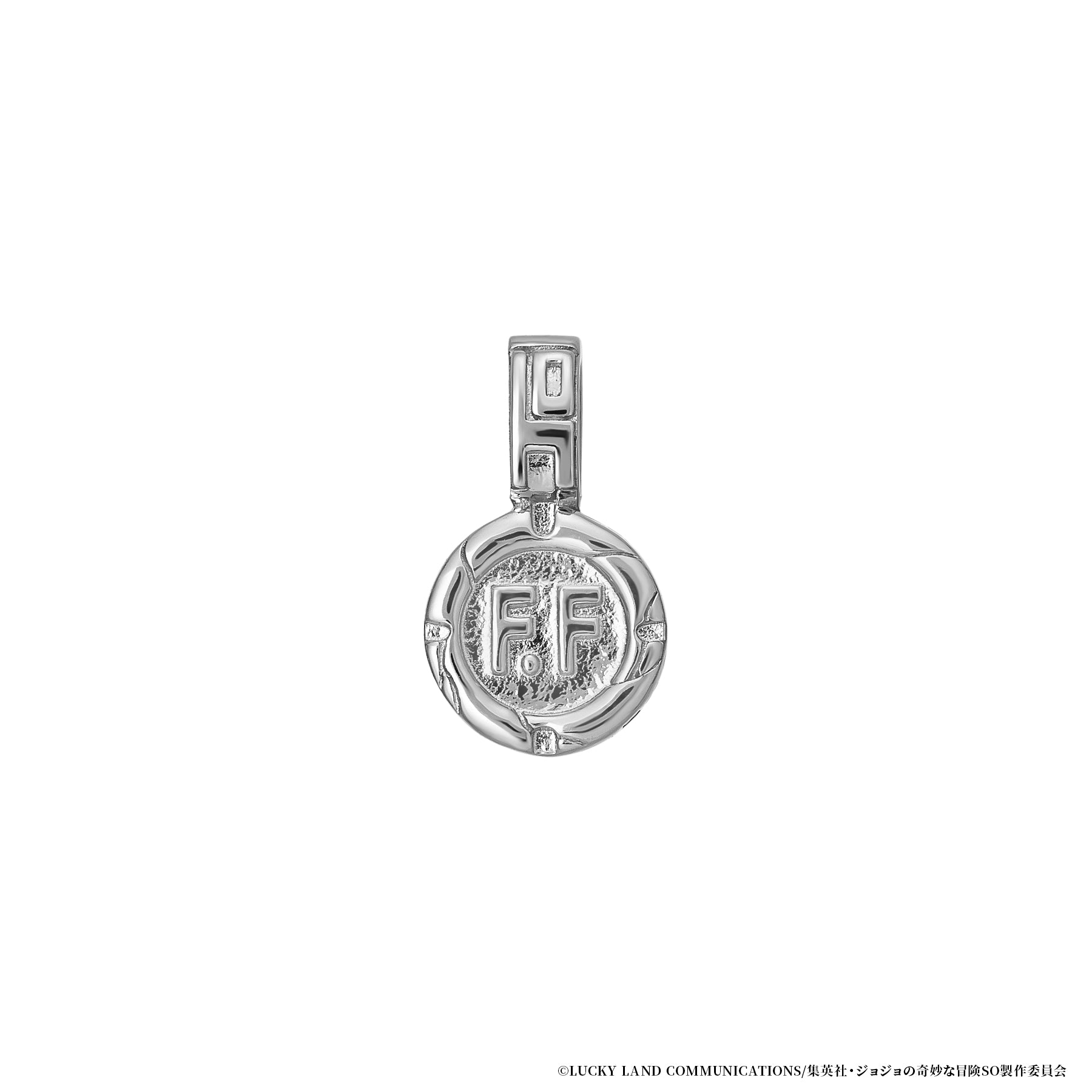 愛称の『F・F』をグラフィカルに表現し、スタンドの肩パーツと腕や足の模様を全体に取り入れています。裏側の中央にはF・Fの髪色をイメージしたペリドットをセッティング。特徴的な髪形をデザインしました。