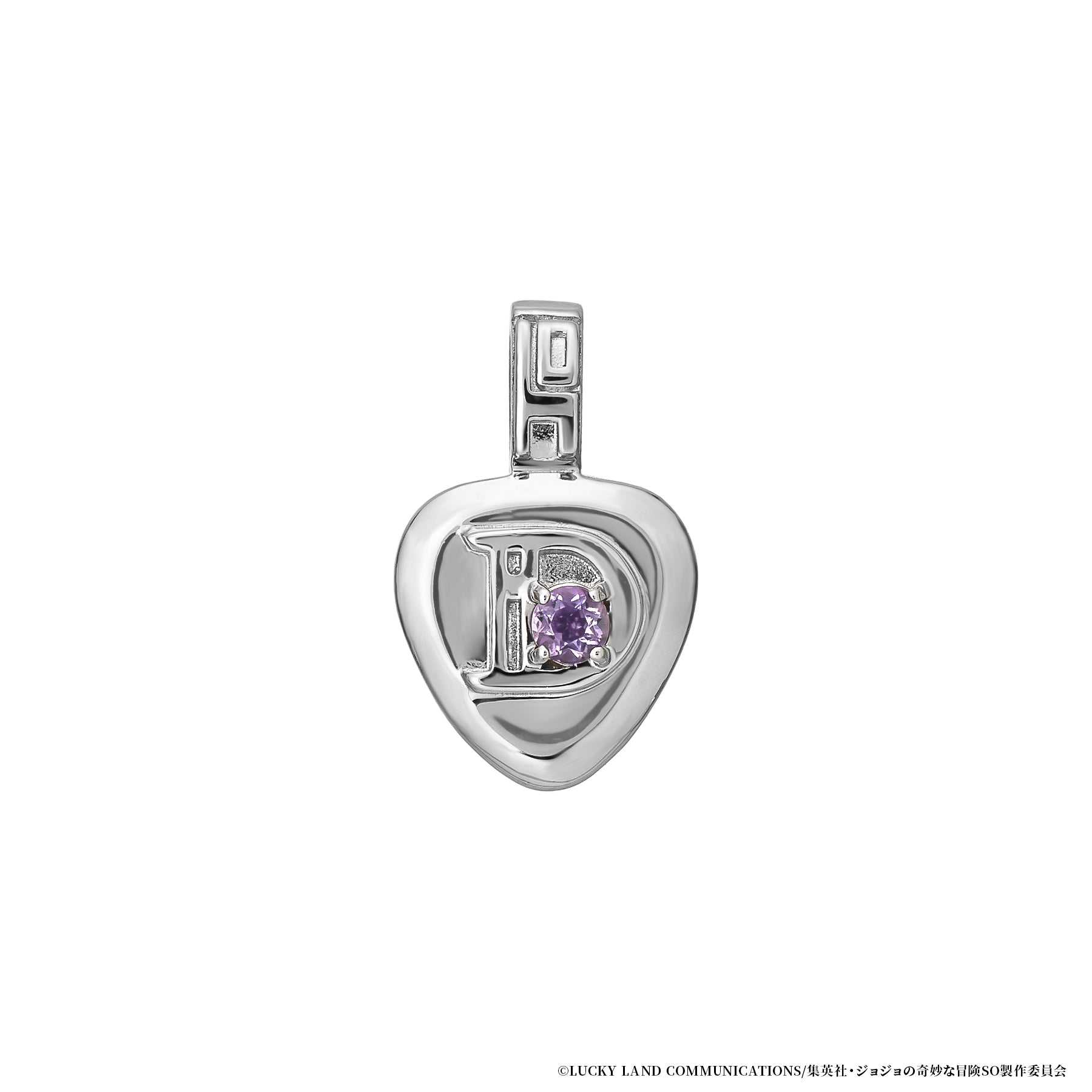 全体のフォルムでナルシソ・Aの帽子の形を表現しました。表側はスタンドから取り入れた『D』のデザインに髪色をイメージしたライトアメジストをセッティング。裏側は特徴的な服装から網目や足跡をデザインしています。
