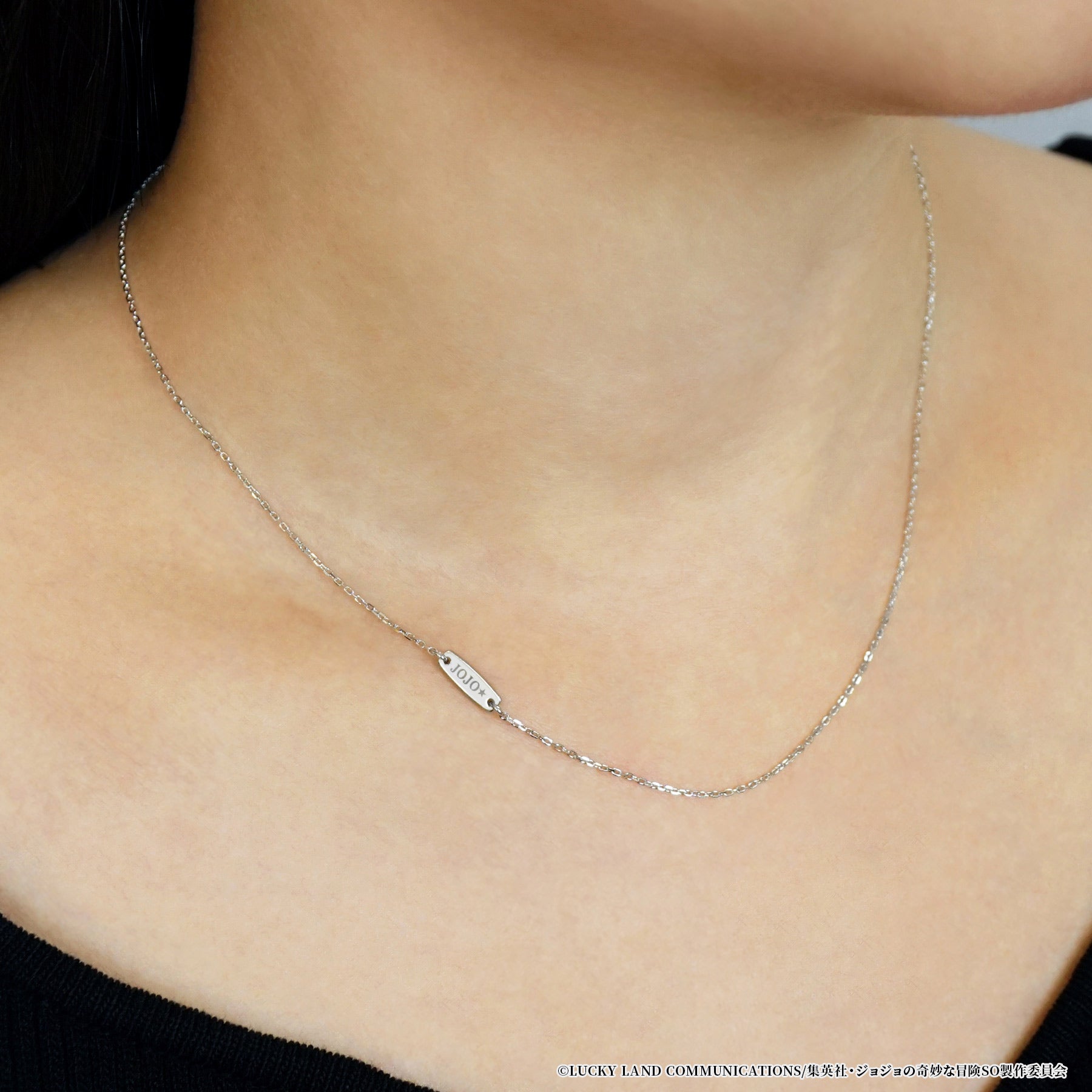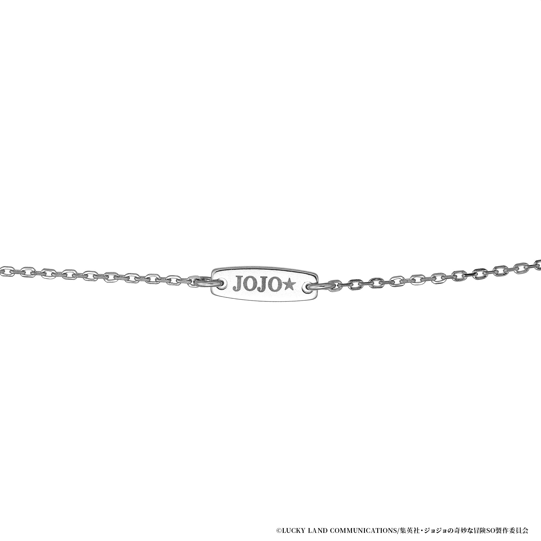 『JOJO★』の刻印が施されたプレートをあしらったチェーンネックレス。ベーシックながら華やかさのあるチェーンを使用し、プレートは中心から少しずらすことで抜け感のあるデザインに仕上げました。別売りのチャームを通して使用するのはもちろん、チェーンだけでもおしゃれに着けていただけます。長さと太さを変えた2種類をご用意しましたので、年齢や性別を問わずペアアイテムとしても楽しめるネックレスです。