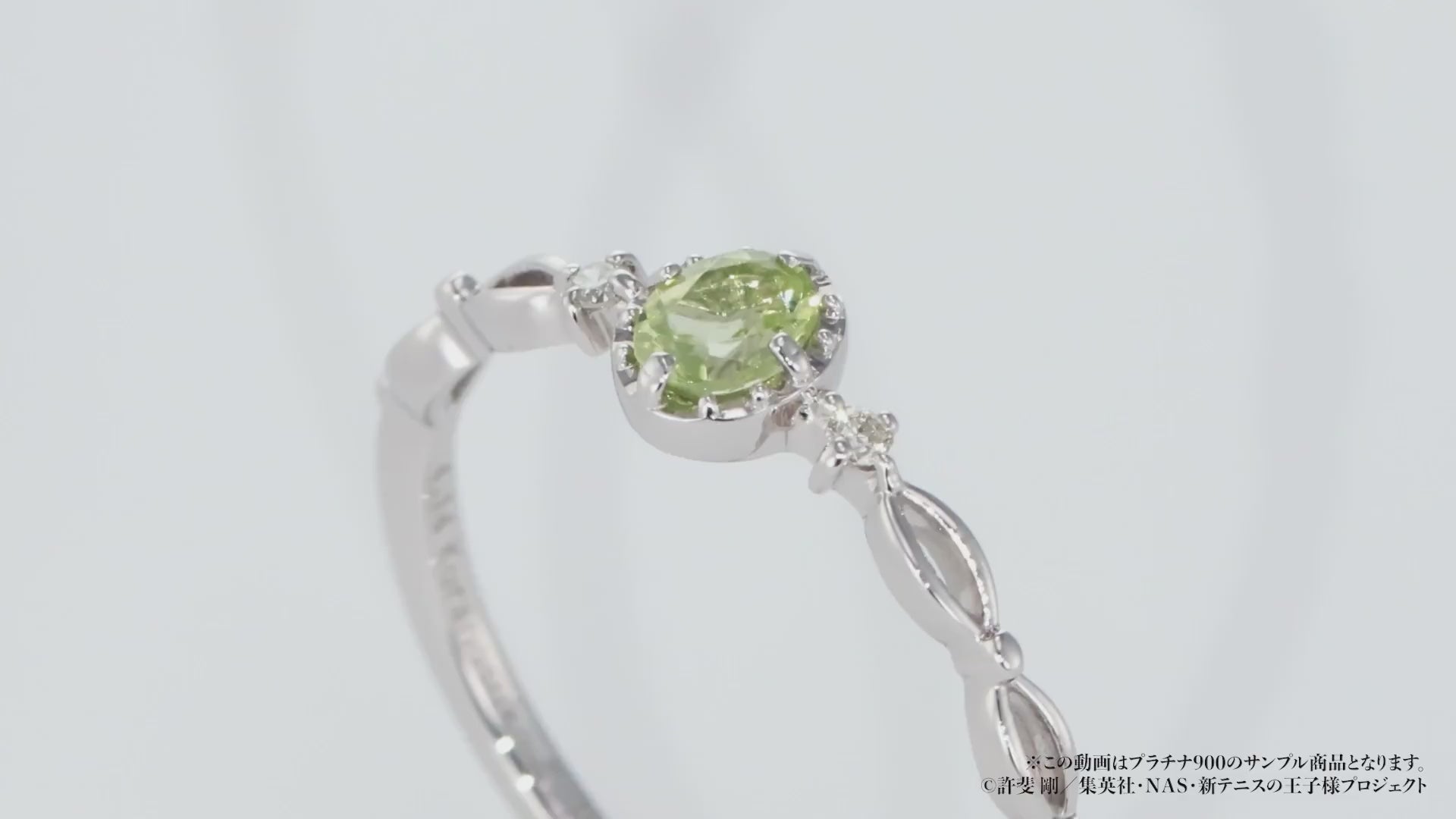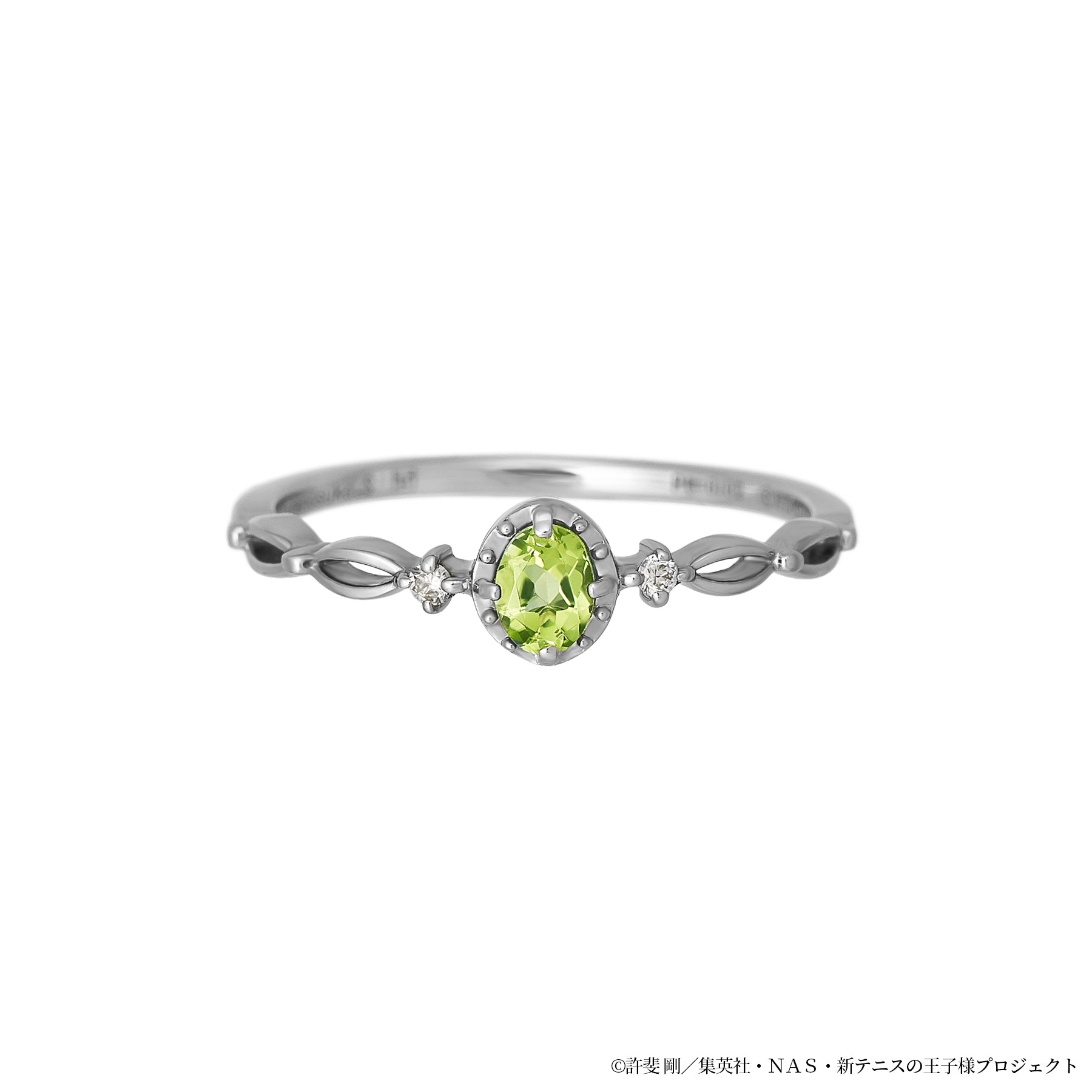 個性派揃いの四天宝寺テニス部を2年生の頃からまとめる部長、白石蔵ノ介。基本に忠実で完璧なテニスがプレイスタイルの白石を表現した、シンプルでデイリー使いしやすいデザインです。センターには白石の好きな“若草色”をイメージしたペリドットをセッティングし、その周りには円卓ショットで分身したボールをイメージして丸いモチーフを12個配置しました。サイドには4月の誕生石であるダイヤモンド(シルバー素材にはダイヤモンドをイメージしたキュービックジルコニア)を使用し、魅力的な輝きをプラスしています。