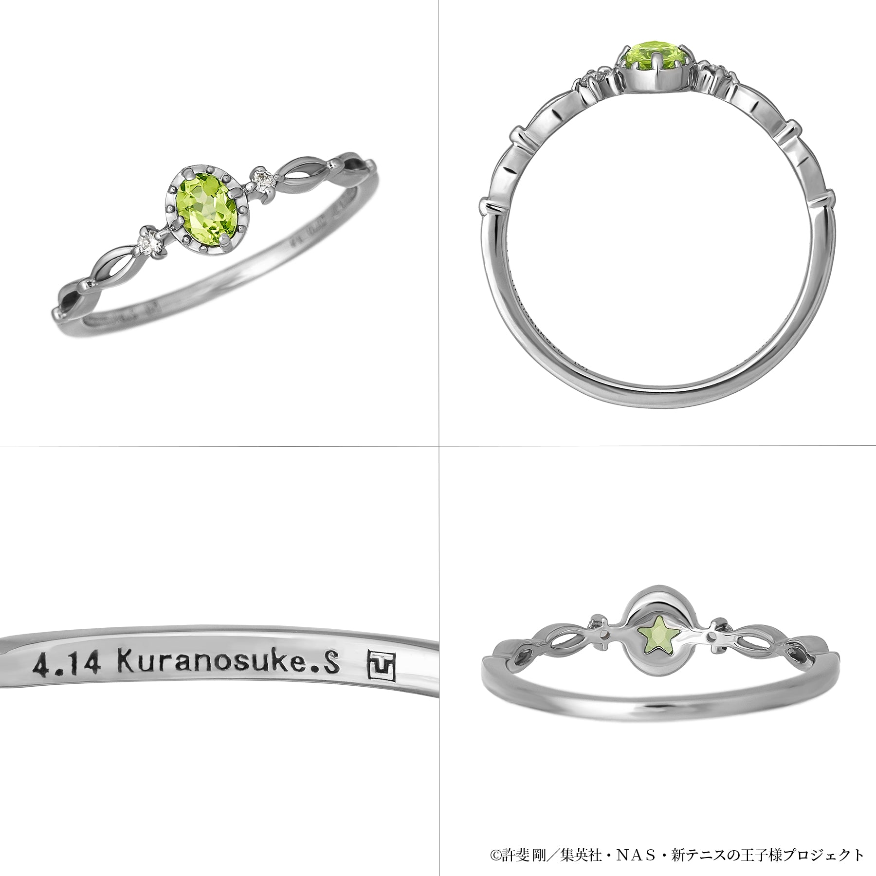 リングの内面には、誕生日“4.14”と名前“Kuranosuke.S”を刻印し、使いやすいデザインの中にキャラクターの要素をしっかりと詰め込んだアイテムになっています。上品なカラーストーン使いとMade in Japanのクオリティーで仕上げた、白石蔵ノ介の誕生日を記念するリングです。
