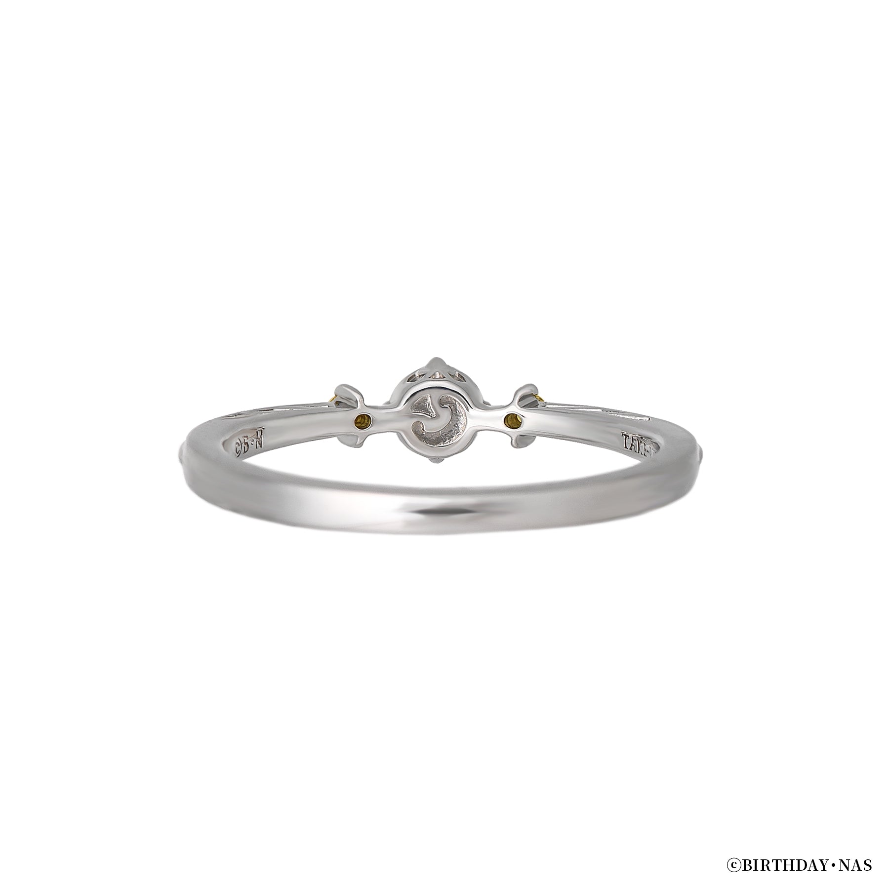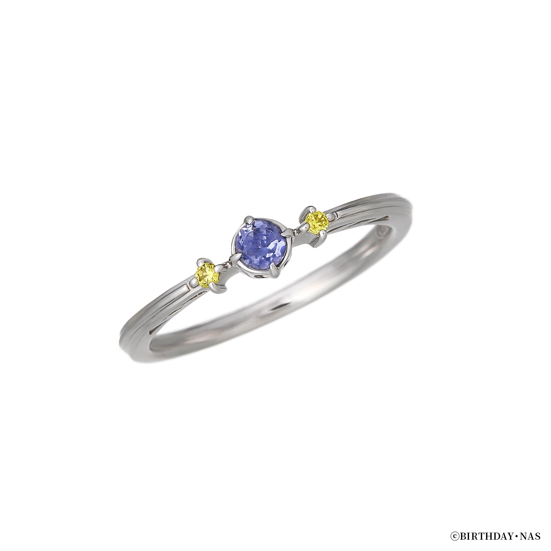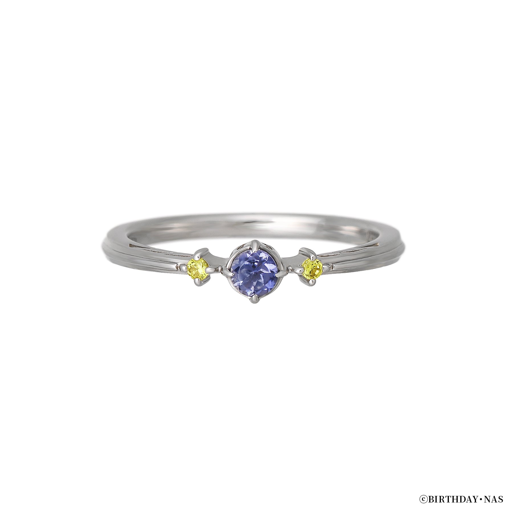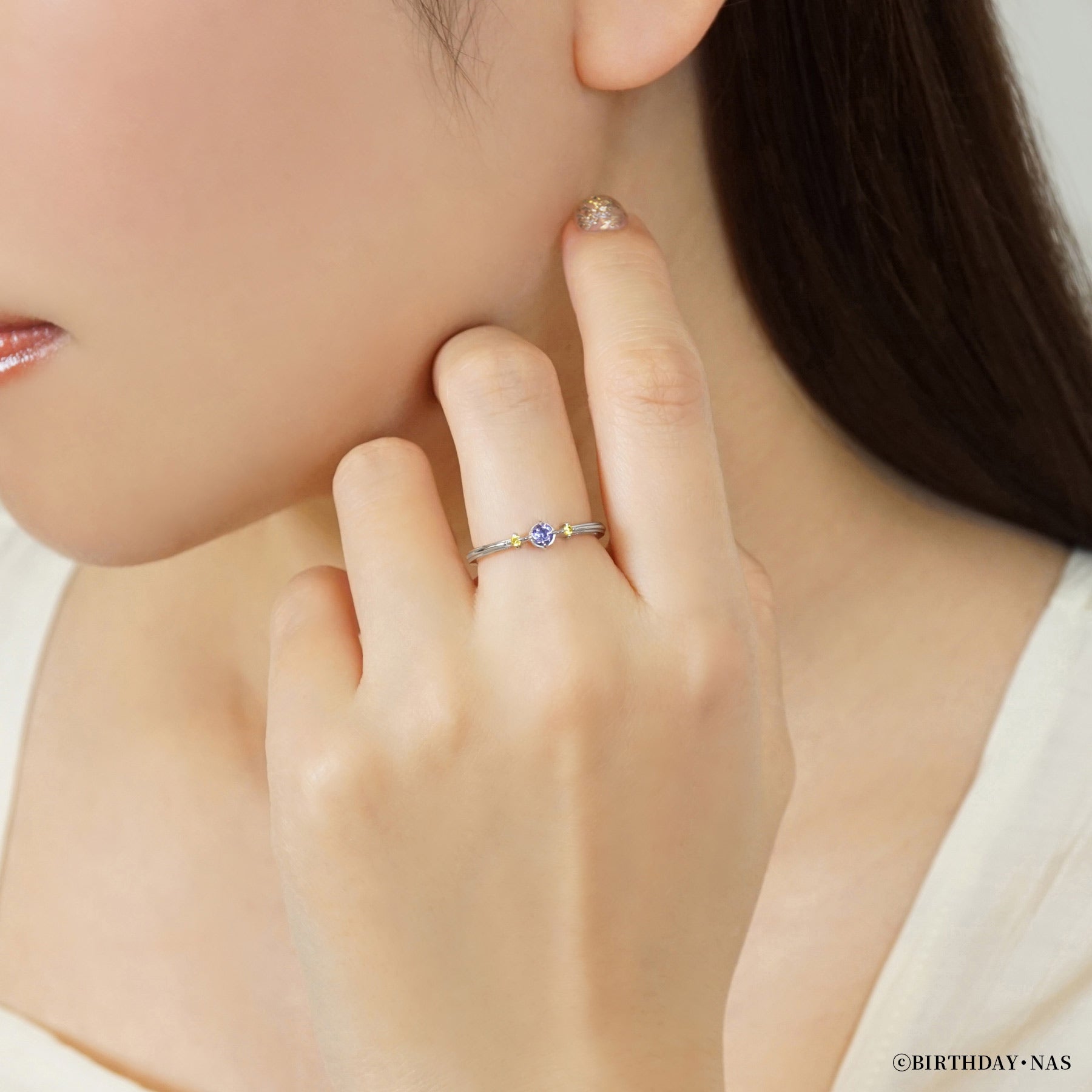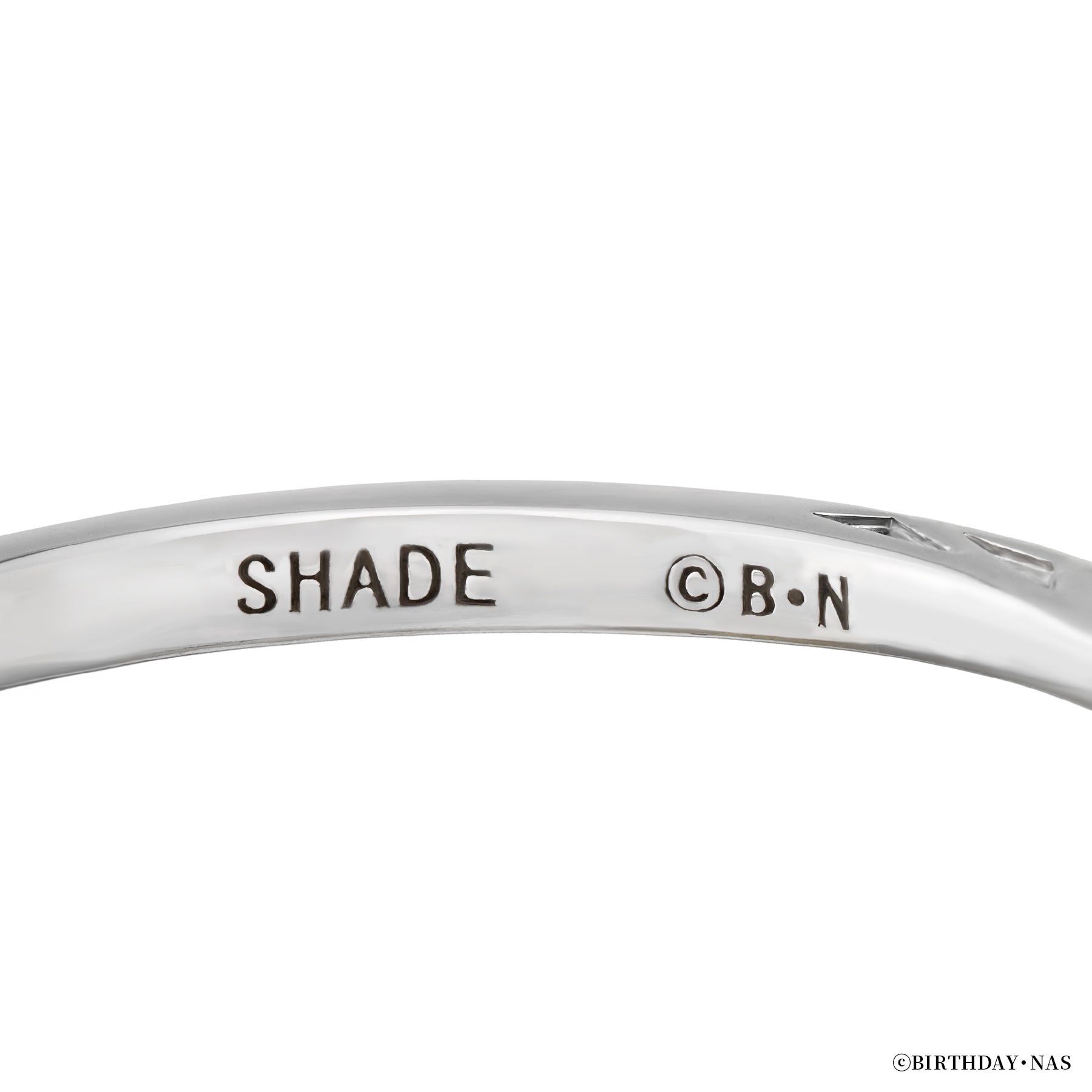大人びていてクールなシェイドを、すっきりとしたストレートのアームとシャープな爪留めで表現し、石座の裏には「月の国」のマークを刻みました。瞳や髪の色を思わせる青紫のアイオライトと、黄色い服を表現したカラーストーンがきらめきます。石座とアームの側面にデザインされた服の柄や、内面の“SHADE”の刻印もさりげないポイントです。