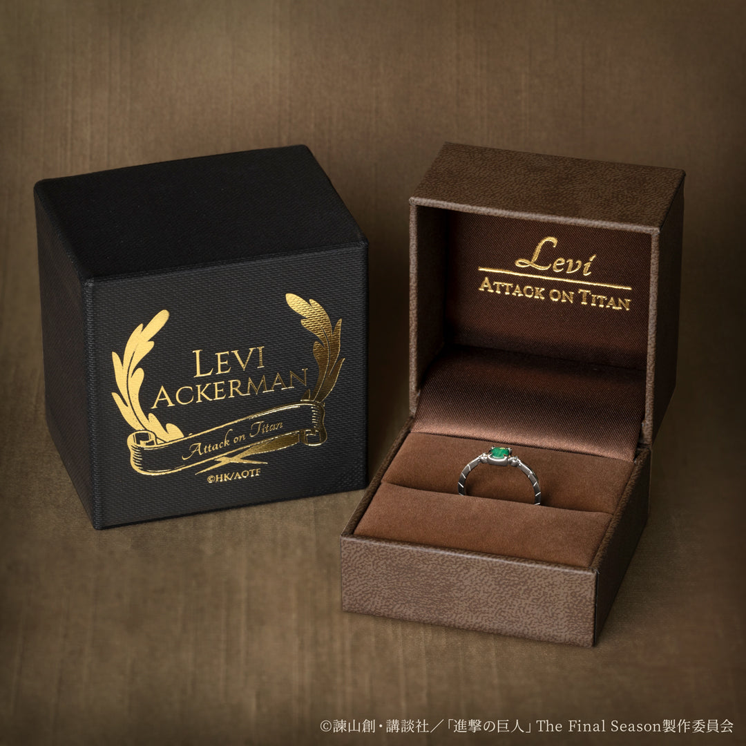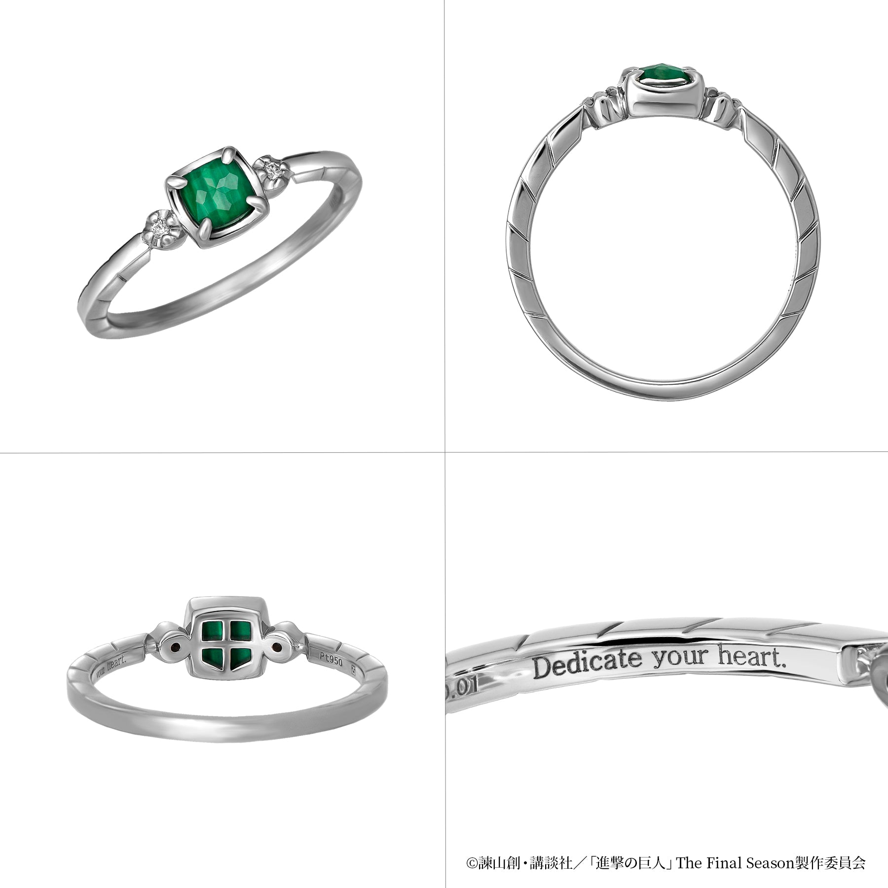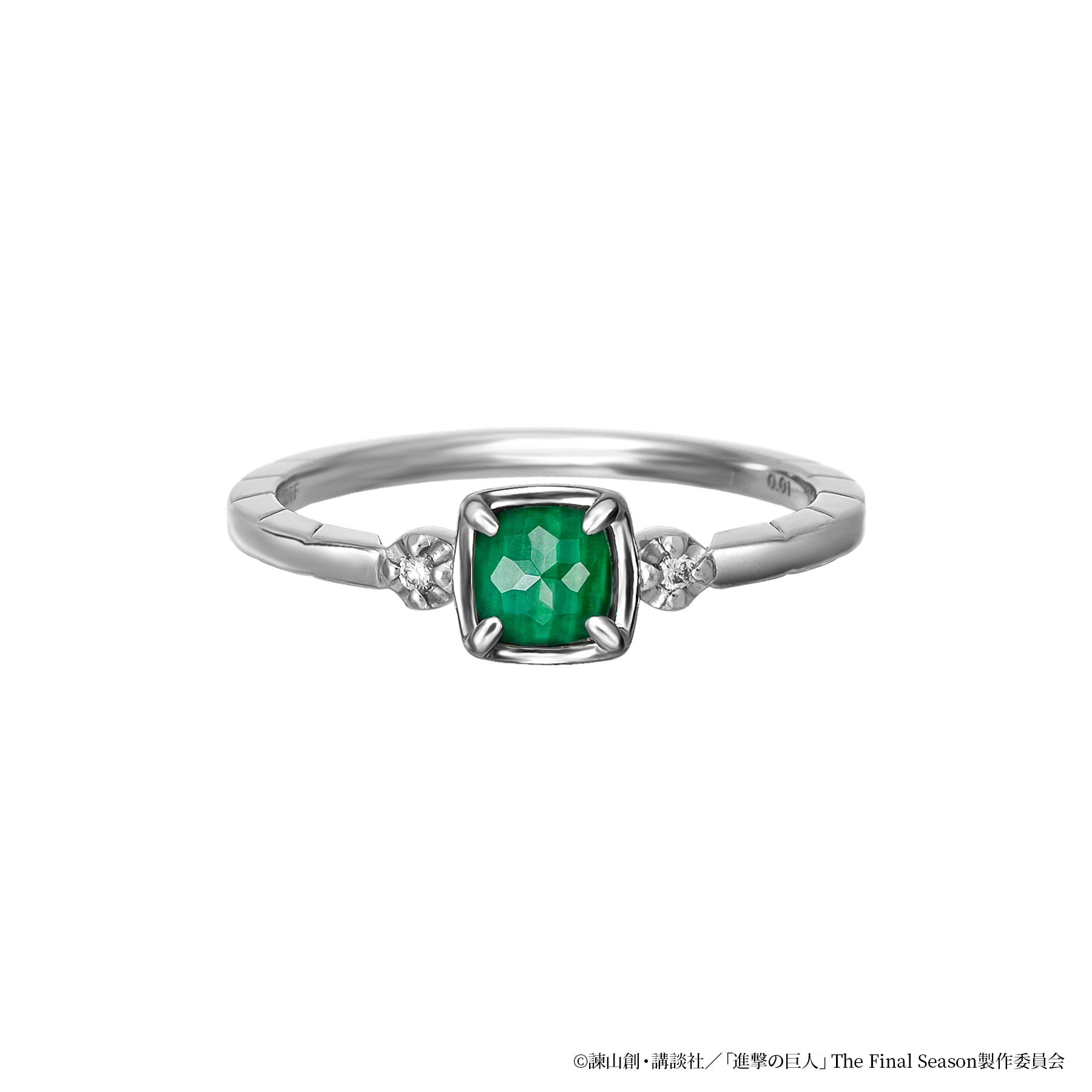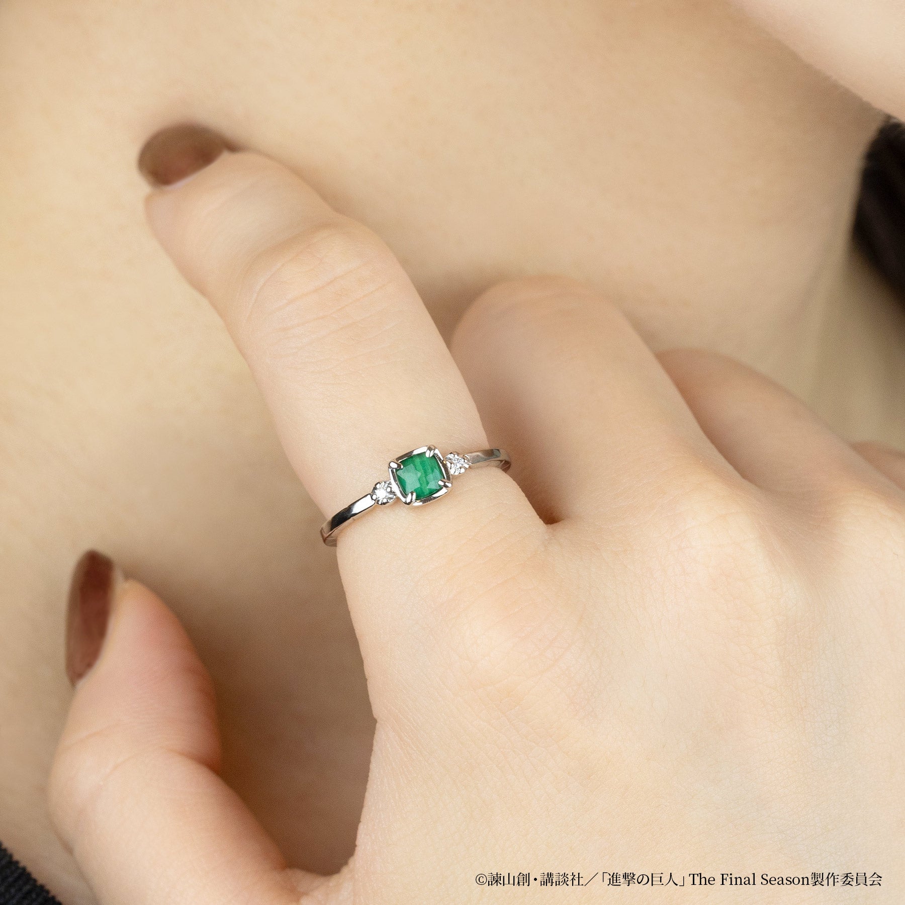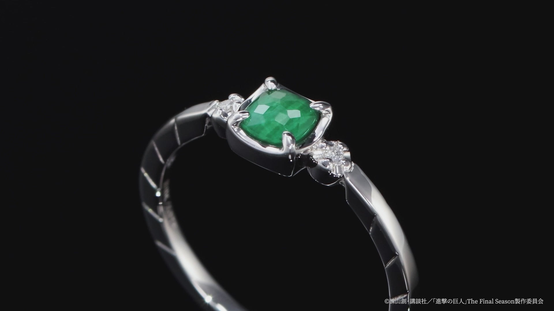 12月25日のリヴァイ兵士長の誕生日を記念してデザインしたリングです。リヴァイ兵士長をイメージしたグリーンの天然石を基調に、つやめくプラチナときらめくダイヤモンドで誕生日に相応しい高級感のある特別なリングに仕上げました。