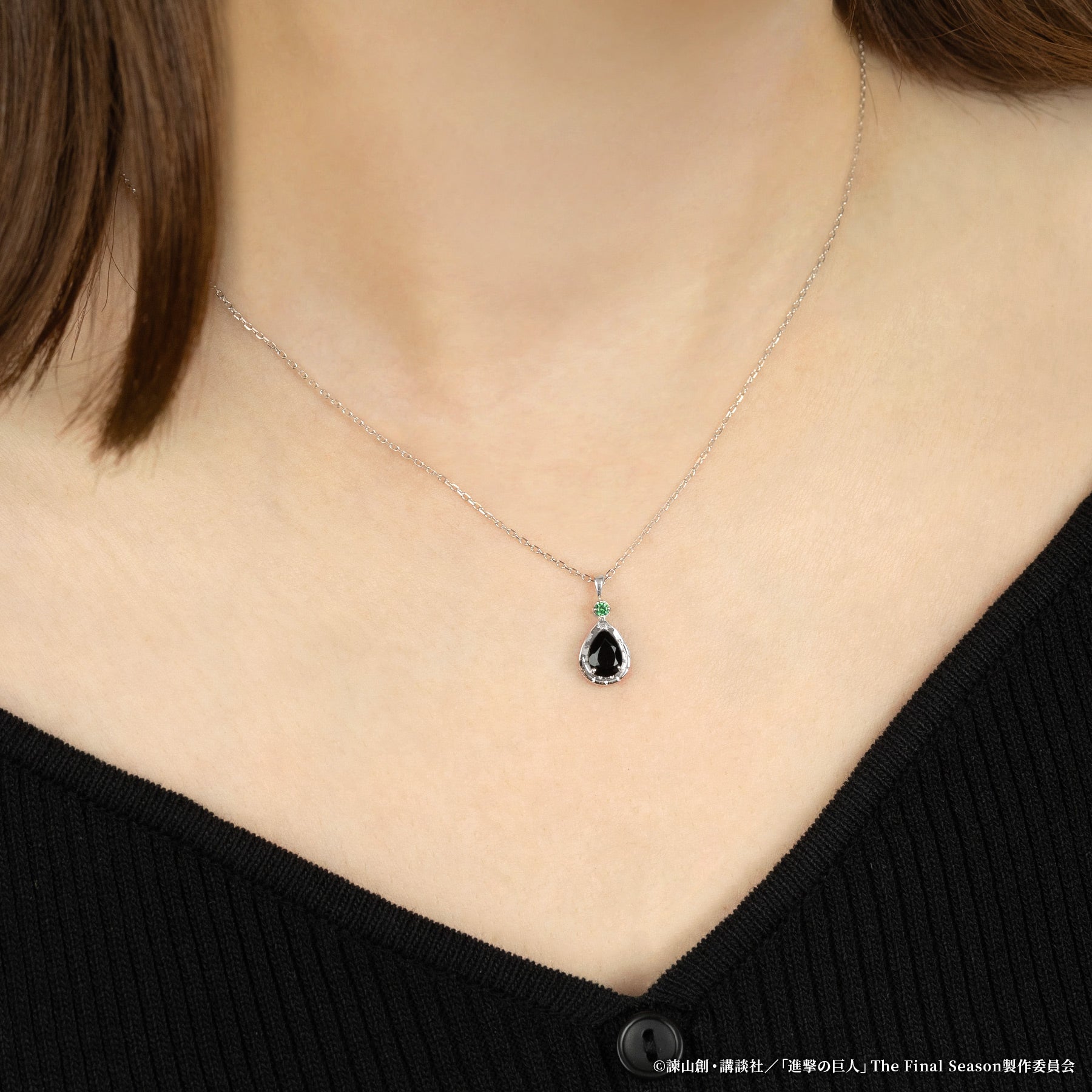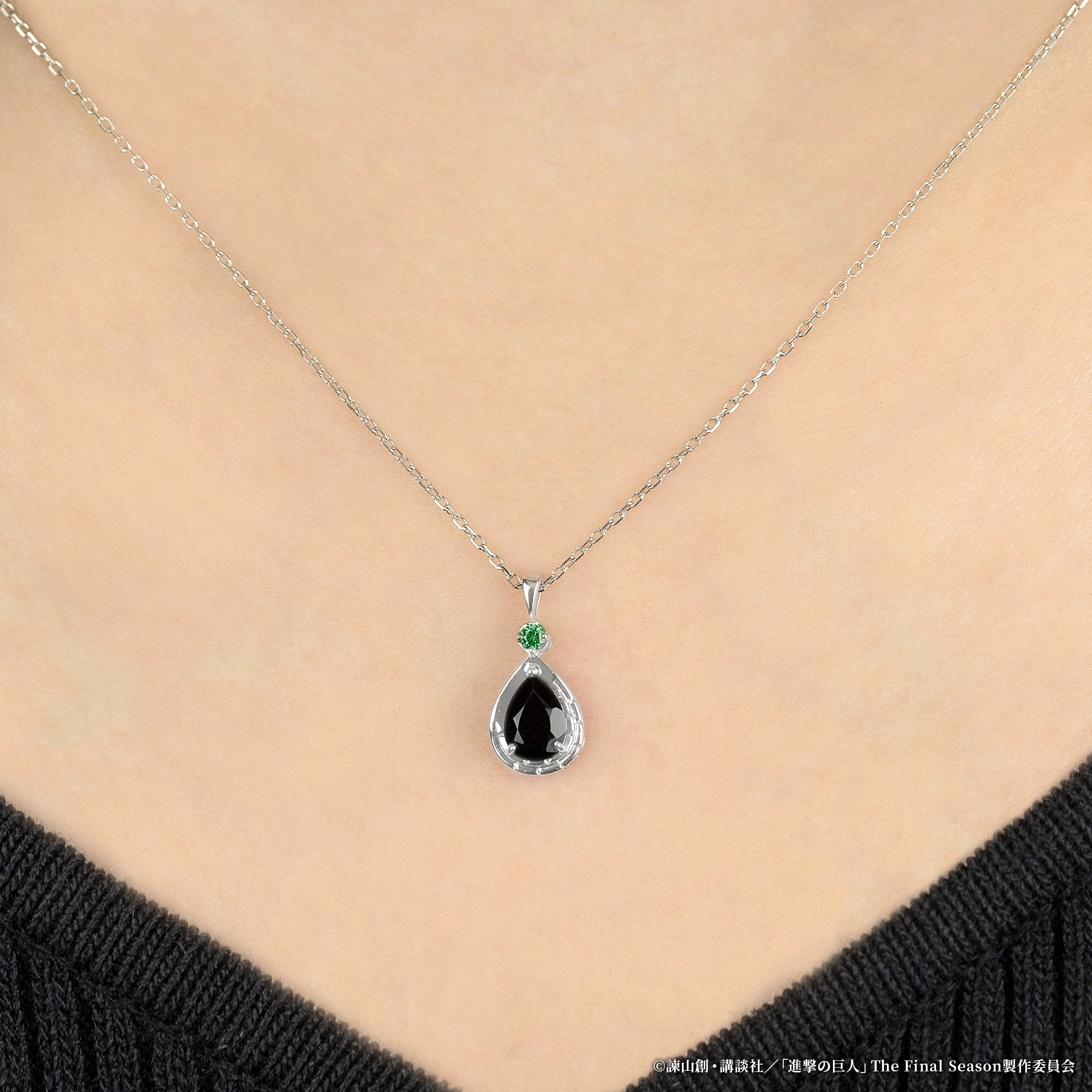 母親が巨人に食べられてしまい、涙を流しながら復讐を誓うシーンをイメージしました。壊されたレンガの街並みをデザインした石枠に、涙をイメージしたしずく型のオニキスをセッティング。オニキスは「忍耐」「成功」の石言葉を持ち、深いブラックカラーはエレンの心情を表現しています。オニキスの上には、エレンの瞳のカラーを思わせるグリーンのキュービックジルコニアがきらめき、裏面にはエレンが身に着けている地下室の鍵を刻印しました。