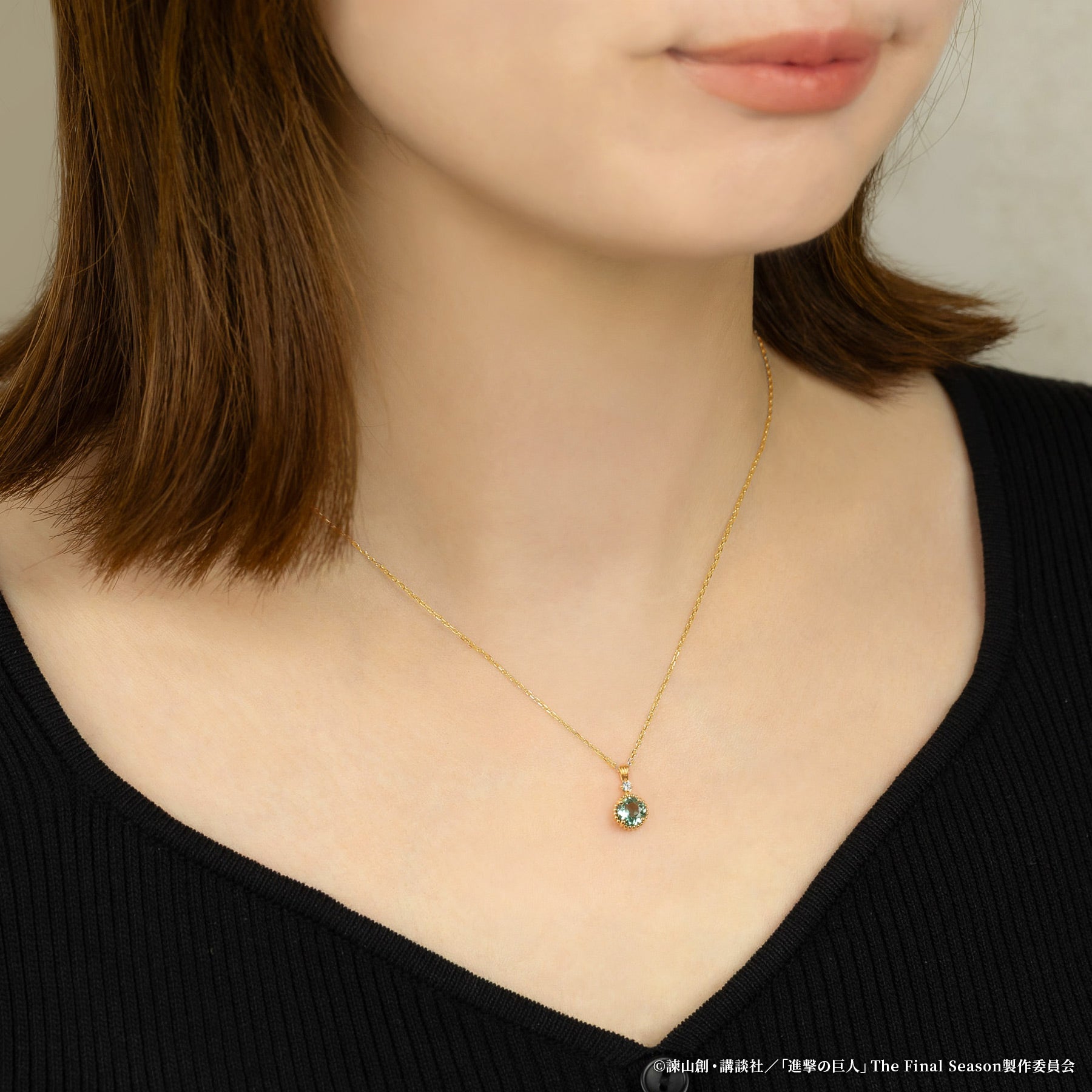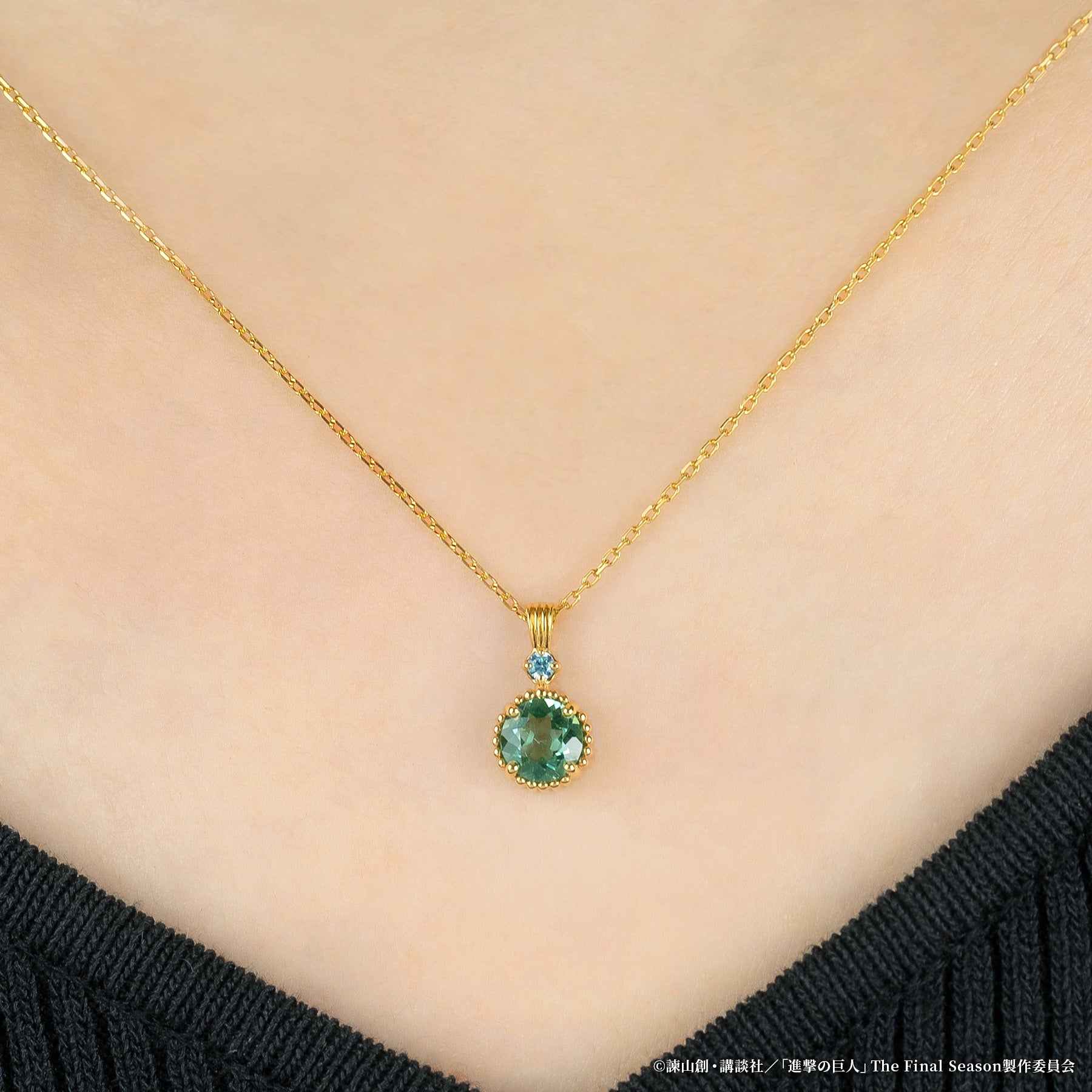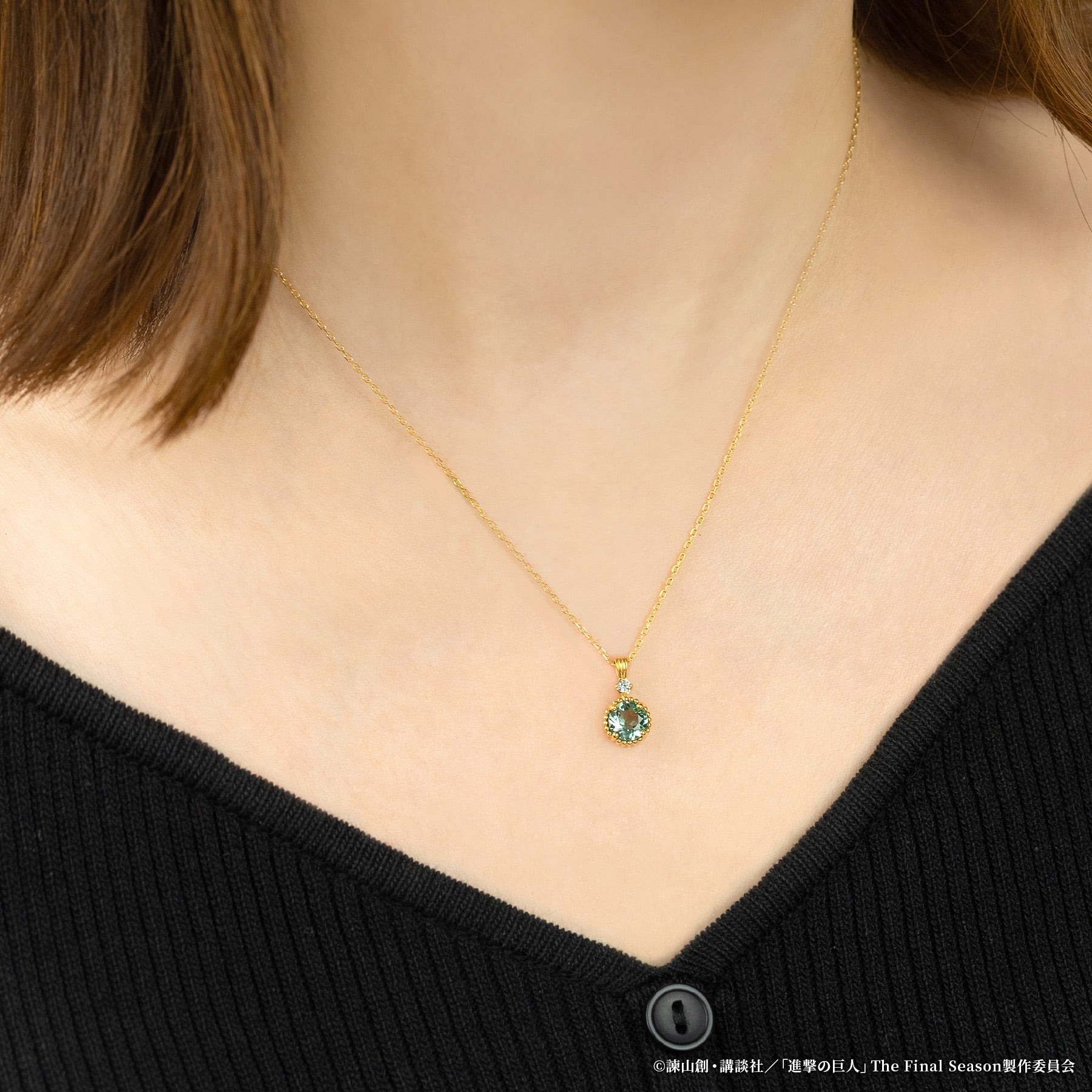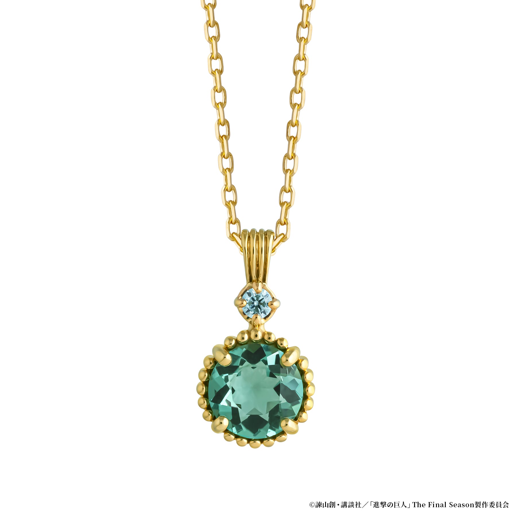 新兵を導き、戦いを挑むシーンをイメージしています。メインには「調和」「再生」の石言葉を持つグリーンクォーツをセッティングし、石を取り囲む細やかなミルグレインで一緒に巨人に立ち向かう数多くの新兵たちを表現しました。バチカンには信煙弾をイメージしたラインを彫り込み、先陣をきって巨人に立ち向かっていくエルヴィンの瞳の色を思わせるライトブルーのキュービックジルコニアをセッティングしています。