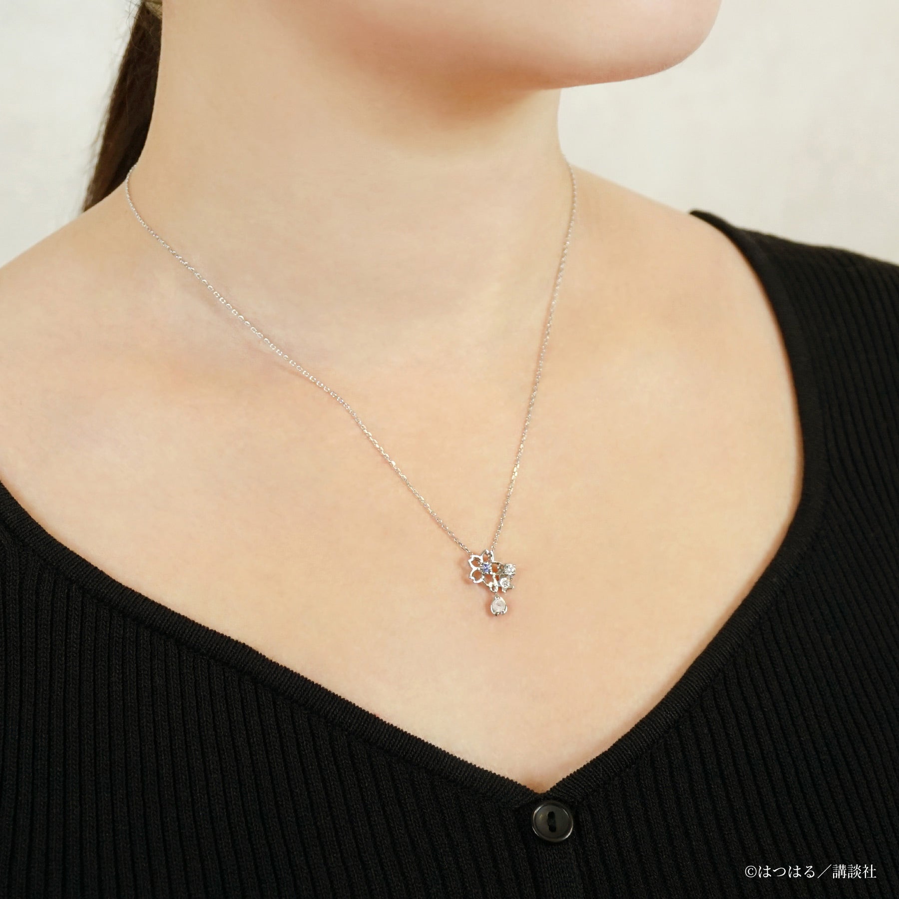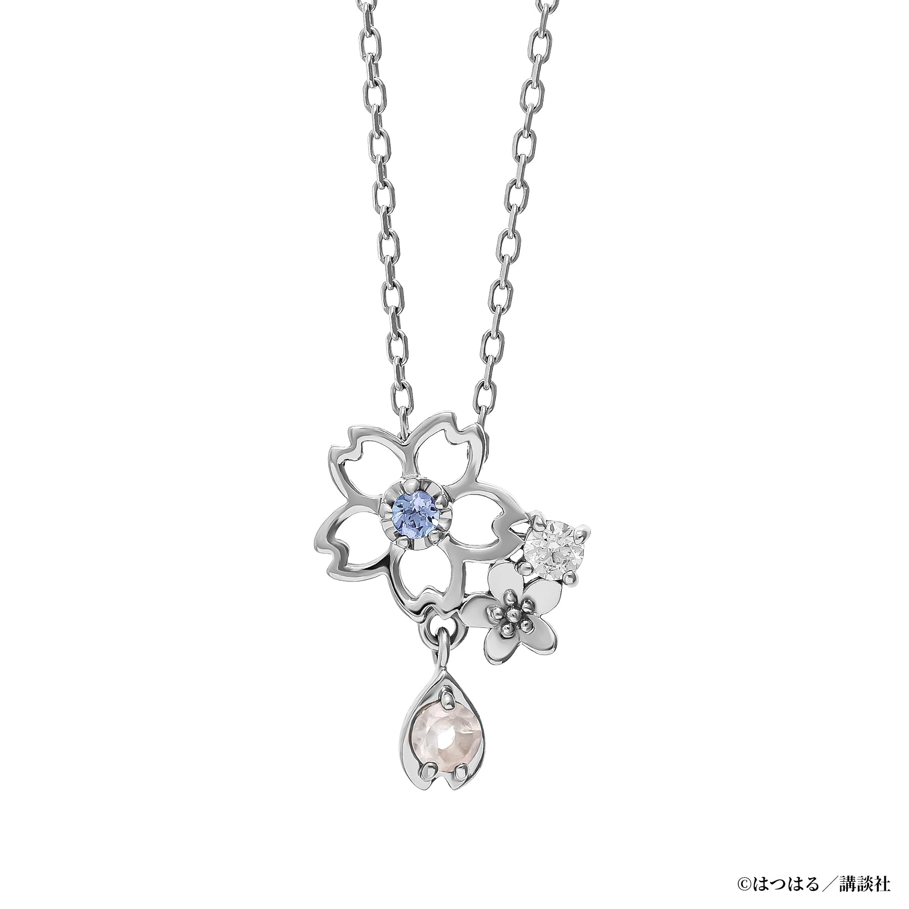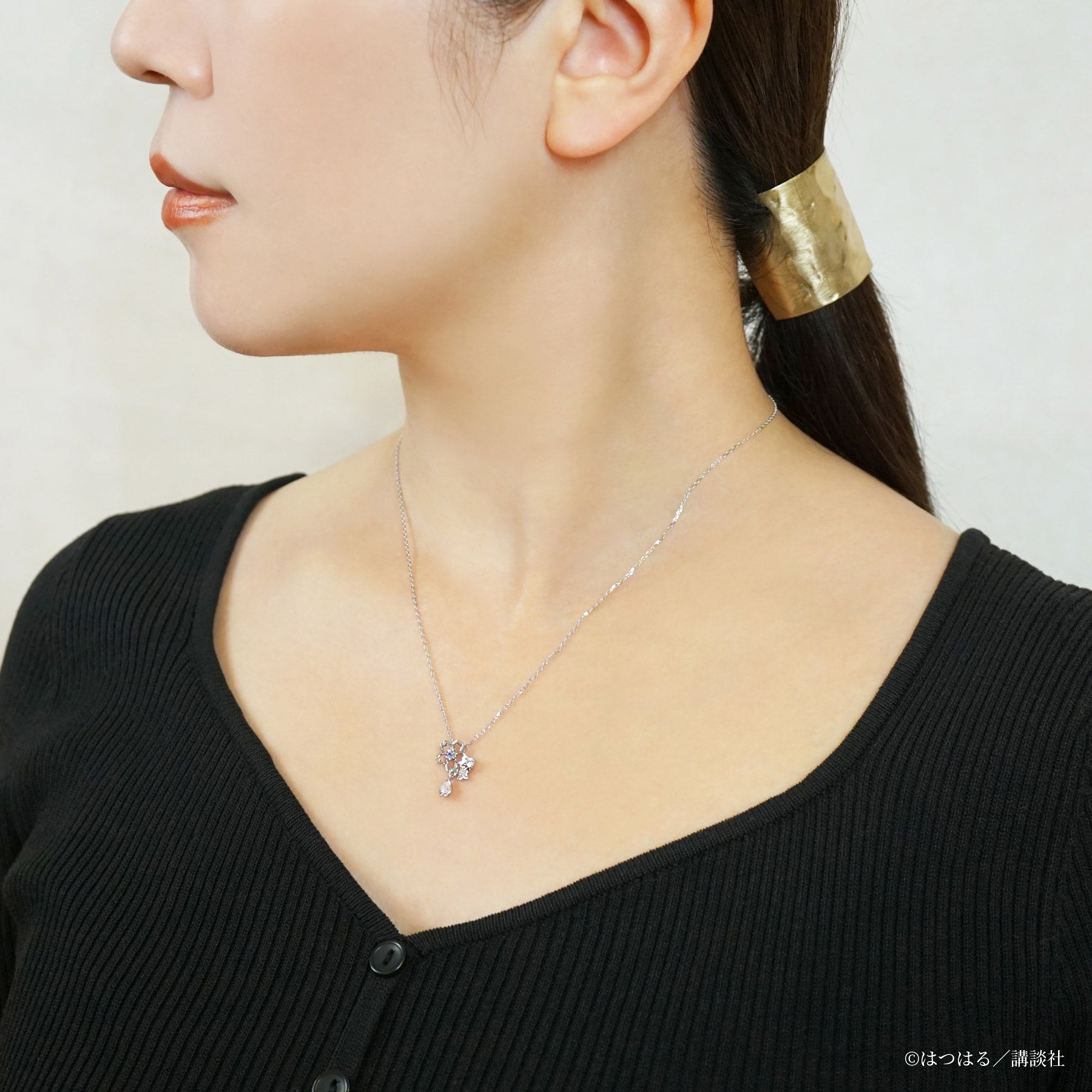 常に寄り添う啓弥と一咲の姿を、二つの桜の花で表現したネックレスです。2人の共通の誕生石でもあるタンザナイトで大人っぽいクールな啓弥をイメージし、クリアに輝くストーンで一咲のピュアな心を表わしています。トップの下に揺れる1枚の花びらには「真実の愛」「愛の告白」といった石言葉を持つローズクォーツが淡くきらめき、大人もデイリーに楽しめる本格的なジュエリーに仕上げました。