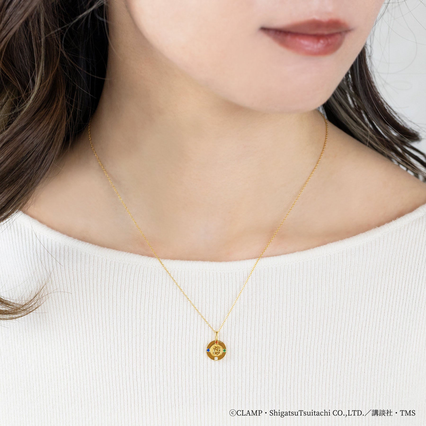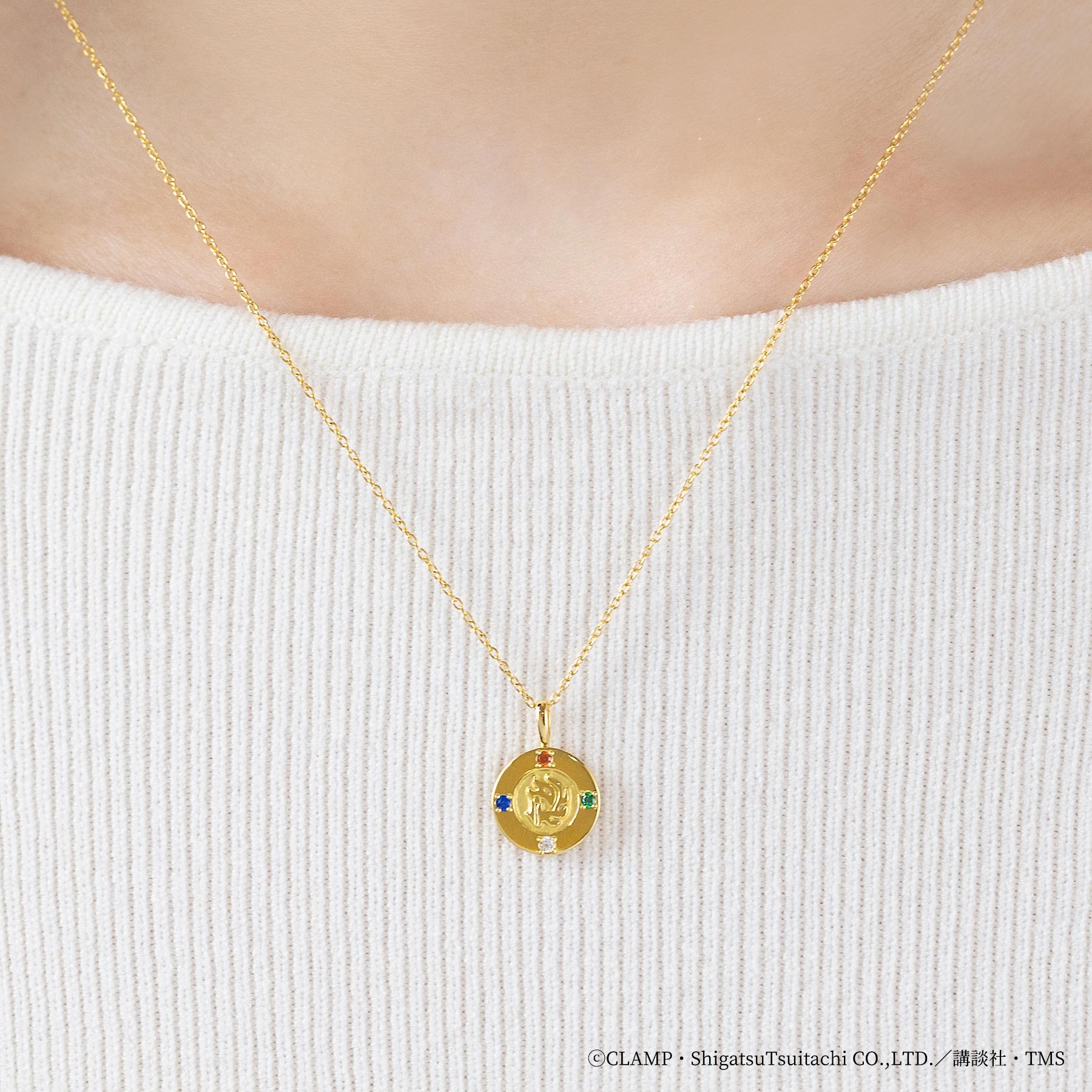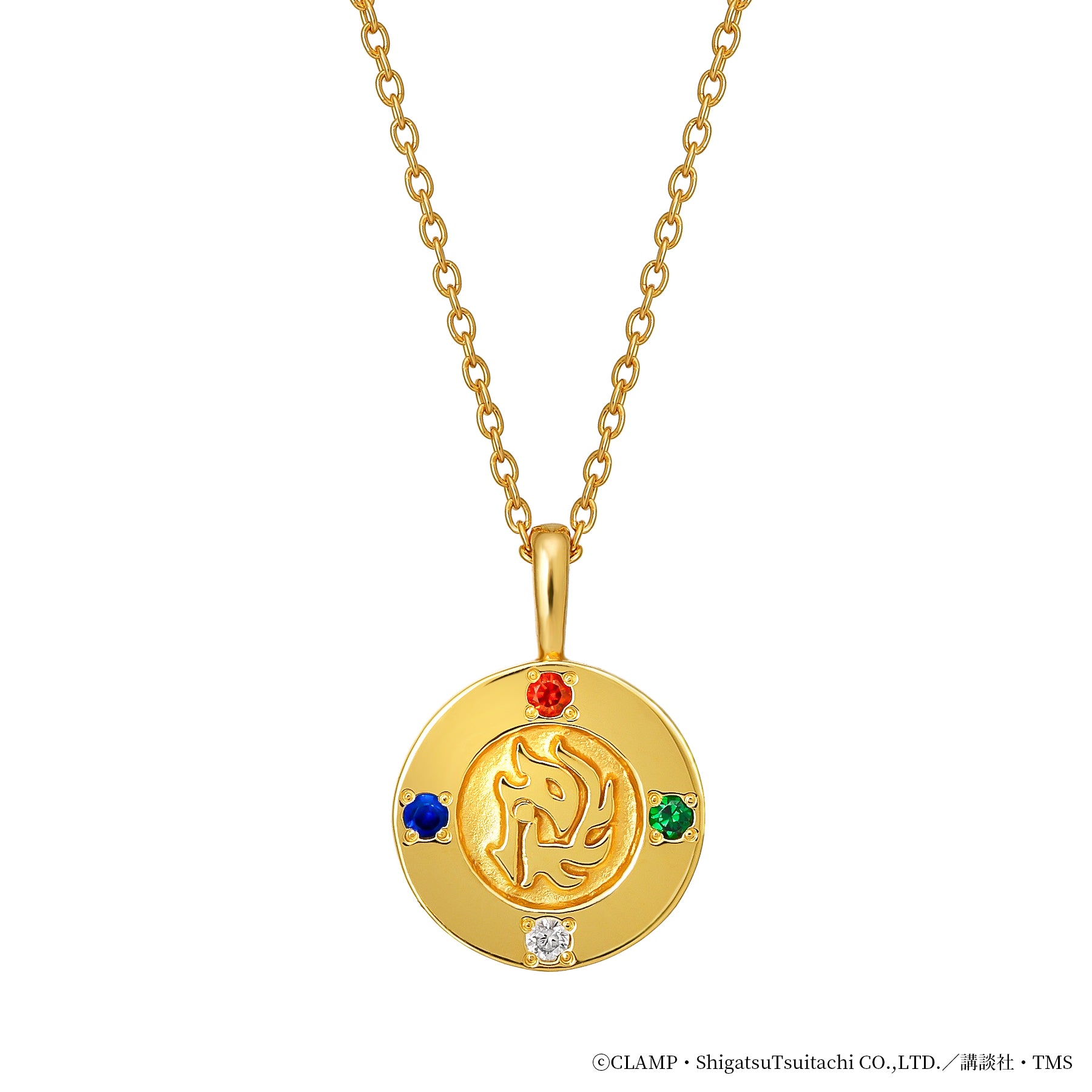 上品なイエローゴールドの色味と身に着けやすいコイン型で作品の世界観をイメージしたリバーシブルネックレスです。獅堂光、龍咲海、鳳凰寺風のイメージカラーであるカラーストーンに、旅や戦いを共にしたモコナをイメージしたキュービックジルコニアの4石がそれぞれ3人の紋章を囲みます。裏側にはモコナのシルエットを彫り込み、モコナが一緒に過ごしていてくれるような姿をイメージしました。