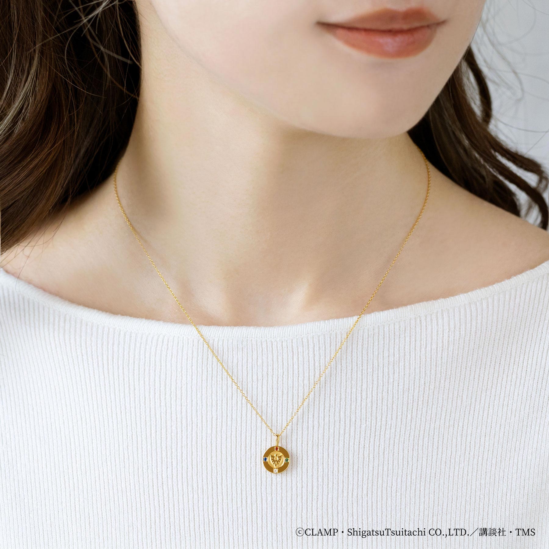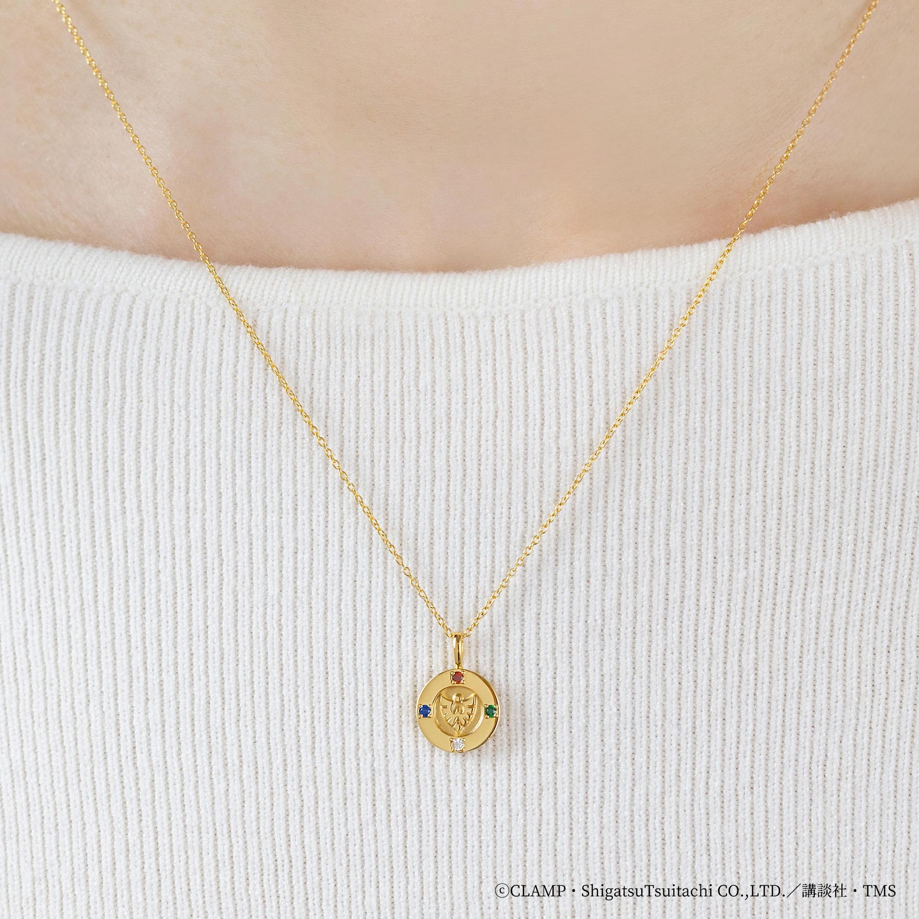 上品なイエローゴールドの色味と身に着けやすいコイン型で作品の世界観をイメージしたリバーシブルネックレスです。獅堂光、龍咲海、鳳凰寺風のイメージカラーであるカラーストーンに、旅や戦いを共にしたモコナをイメージしたキュービックジルコニアの4石がそれぞれ3人の紋章を囲みます。裏側にはモコナのシルエットを彫り込み、モコナが一緒に過ごしていてくれるような姿をイメージしました。