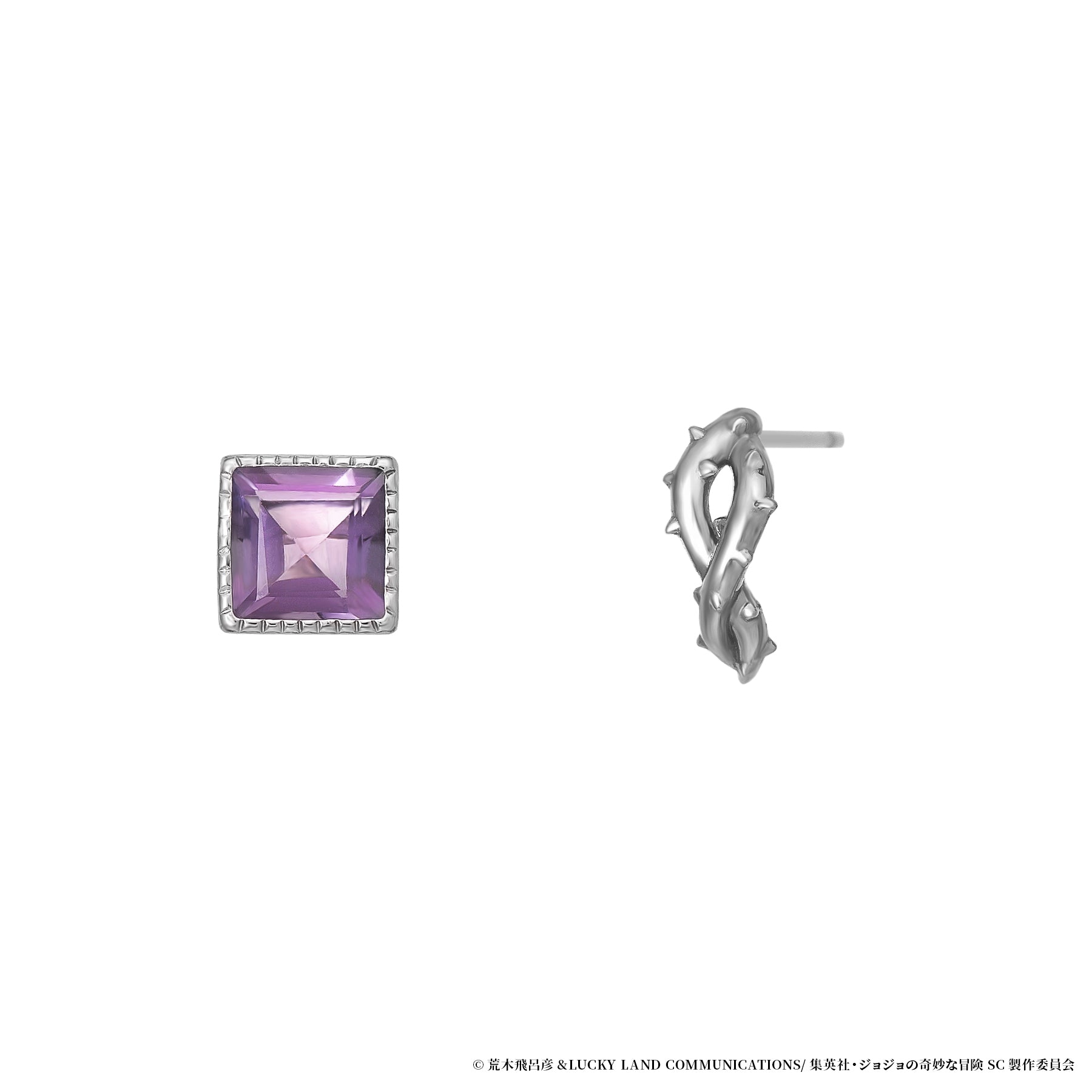 ハーミットパープルのカラーを思わせるライトアメジストを使用。髪や髭をイメージしたシルバーカラーの石枠に落ち着いたスクエアフォルムの石をセッティングし、ジョセフを表現しました。茨デザインの地金のピアスとセットです。