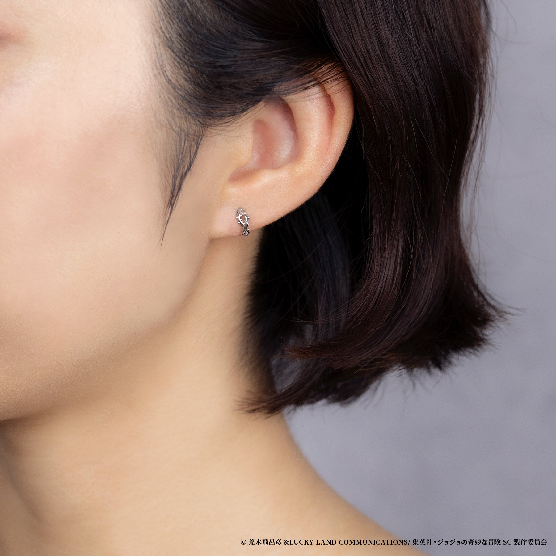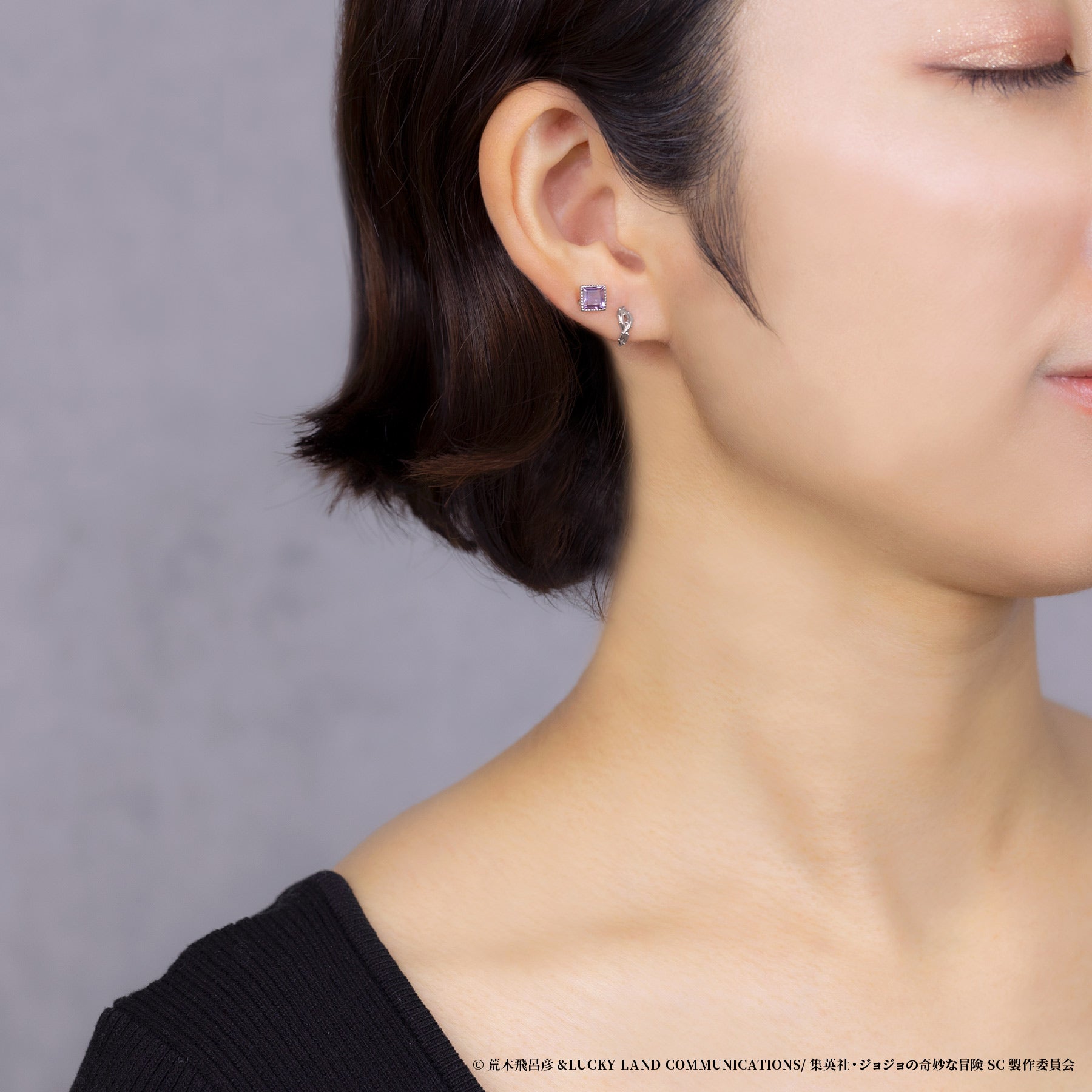 キャラクターやスタンドをイメージしたカラーの天然石と象徴的なモチーフのデザインを組み合わせたスタッズピアス。