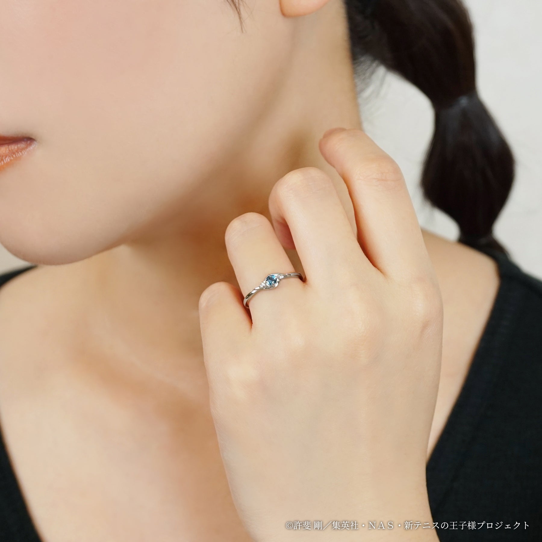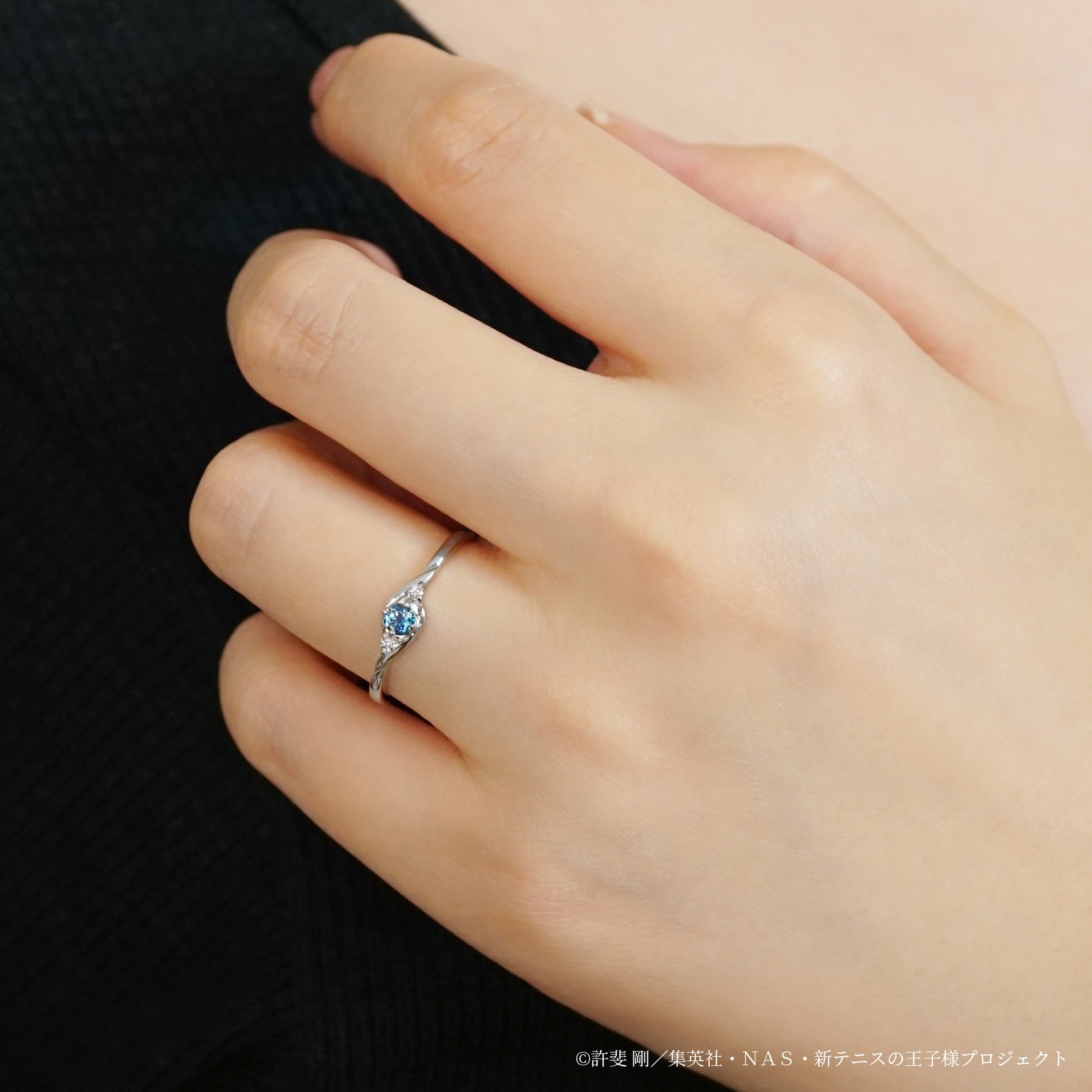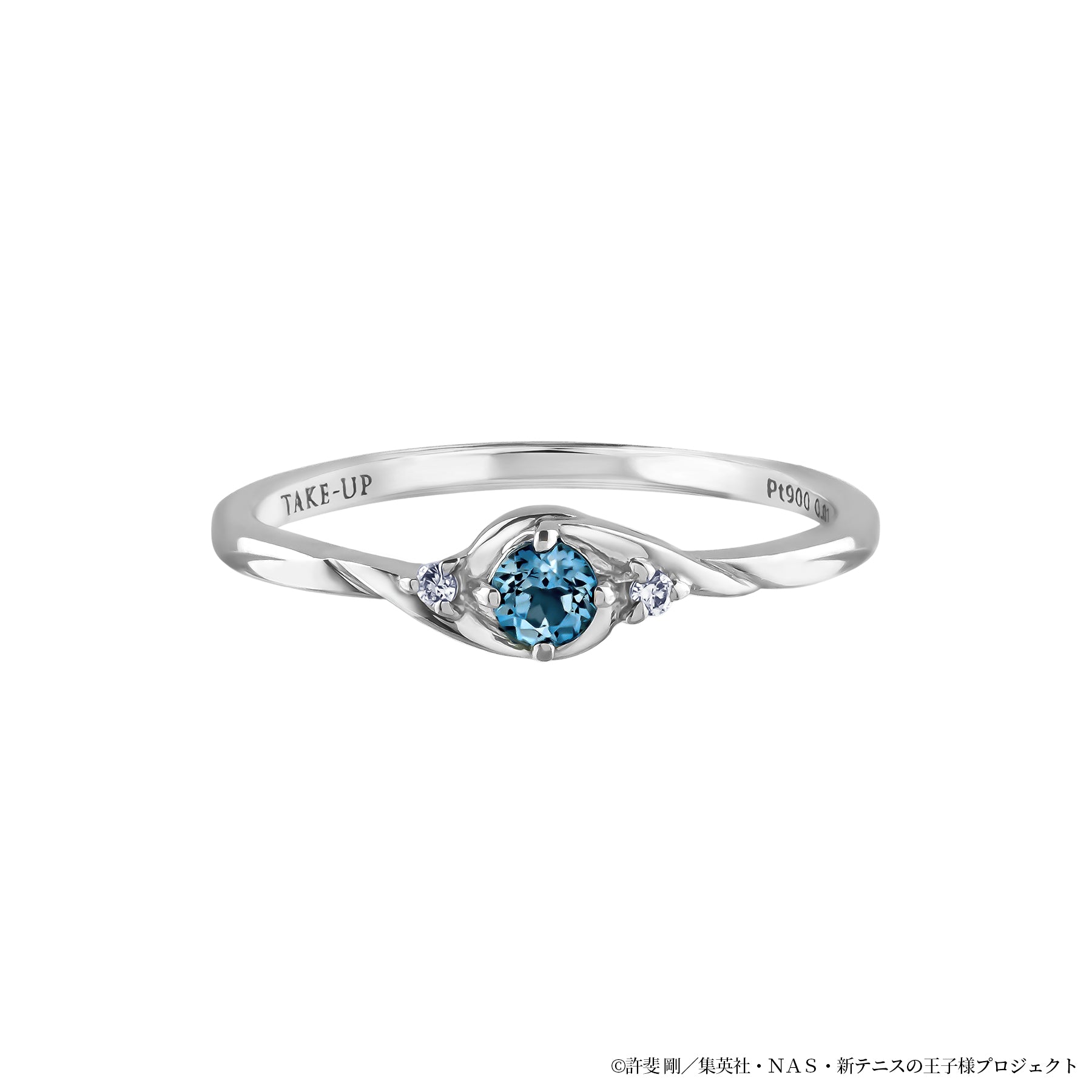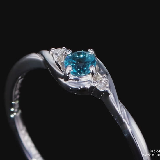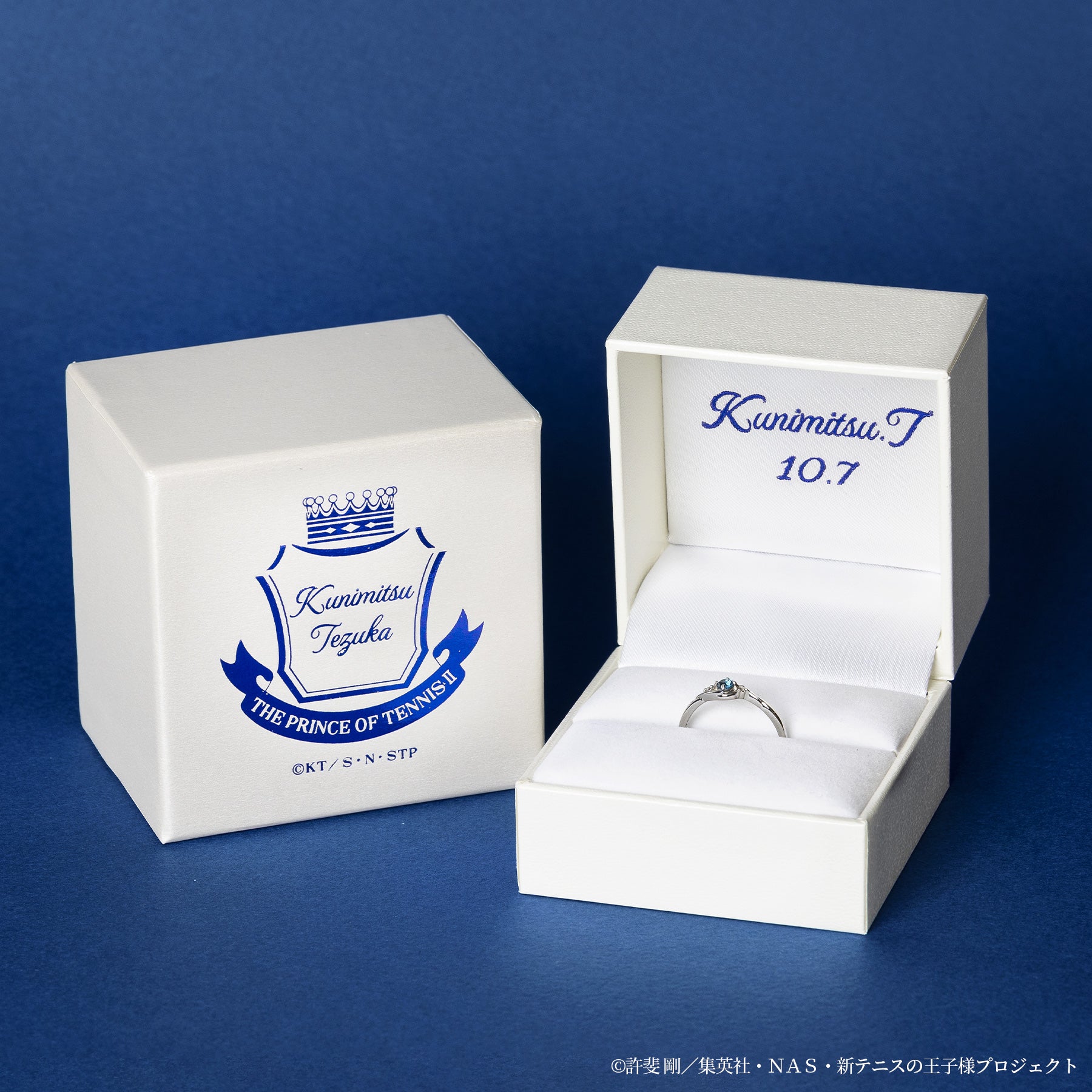 中学テニス界でその名を知らない人はいない程の実力者でありながら、学校では生徒会長も務める名実共にトップの手塚を表現したリングです。 常に冷静で真面目な手塚をイメージし、センターには「冷静」「知性」を象徴するロンドンブルートパーズをセッティング。深みのある落ち着いたブルーが、大人の雰囲気を放つ手塚にぴったりです。サイドには輝くダイヤモンド(シルバー素材にはキュービックジルコニア)を添え、怪我を乗り越えて活躍する手塚の不屈の精神を表現しています。 手塚をイメージしたブルートパーズに向かって吸い込まれるように渦を描くデザインは、球の回転を自在に操り、相手の打球を全て自分の手元へ戻す“手塚ゾーン”をイメージ。 リングの内側には誕生日と名前を刻印し、普段使いでおしゃれに使いつつも、キャラクターの要素をしっかりと詰め込んだアイテムになっています。 上品なカラーストーン使いとMade in Japanのクオリティーで仕上げた、手塚の誕生日を記念するのにふさわしいリングです。