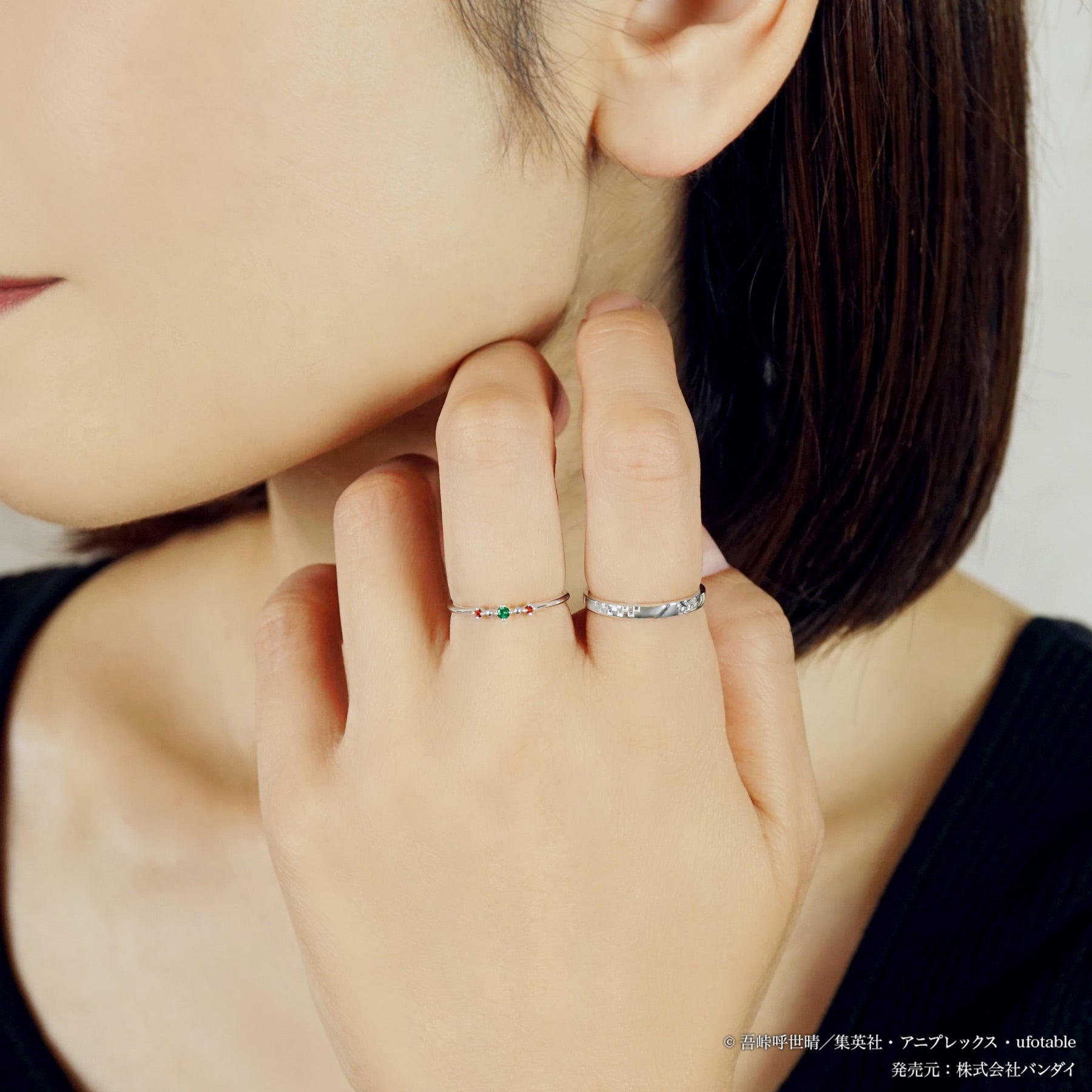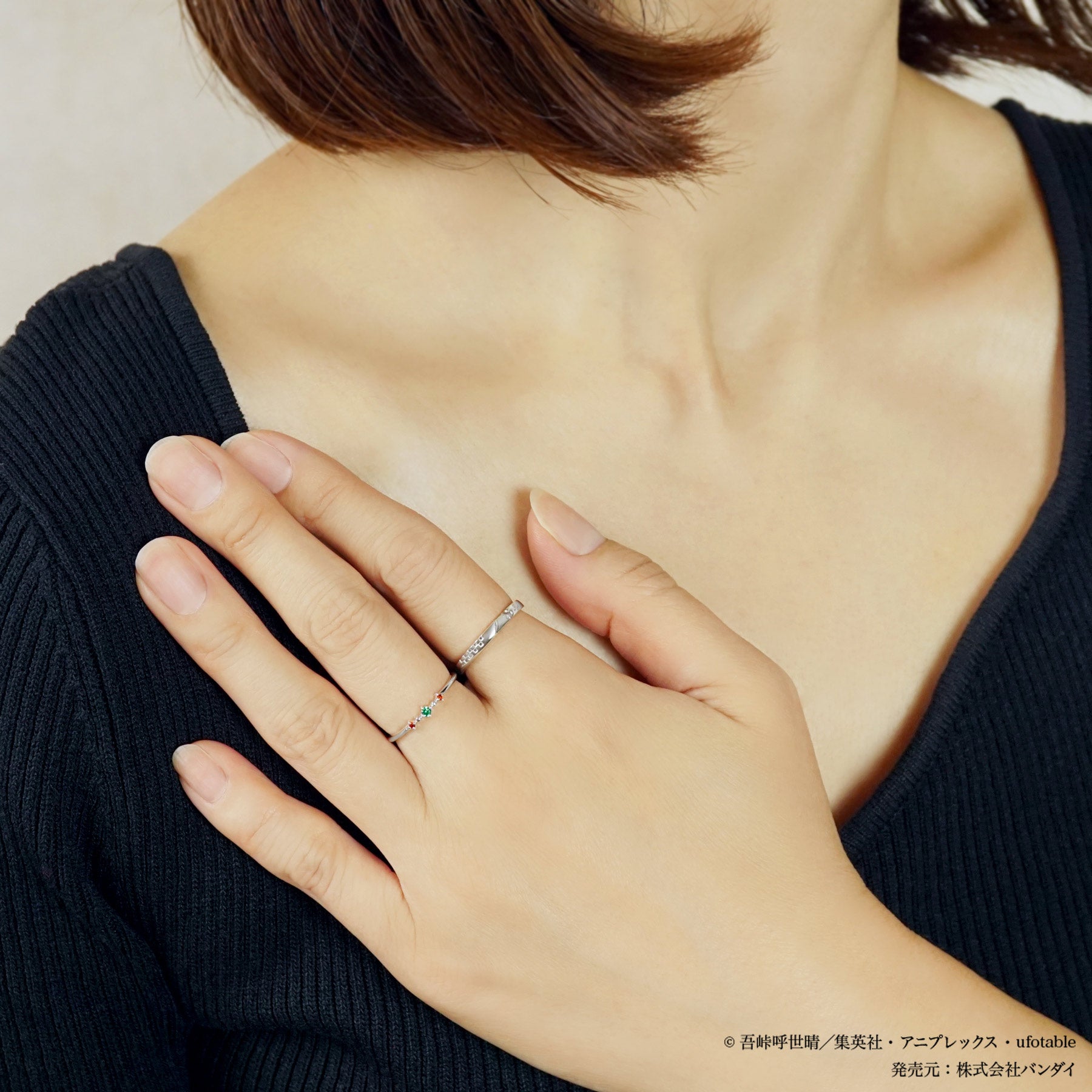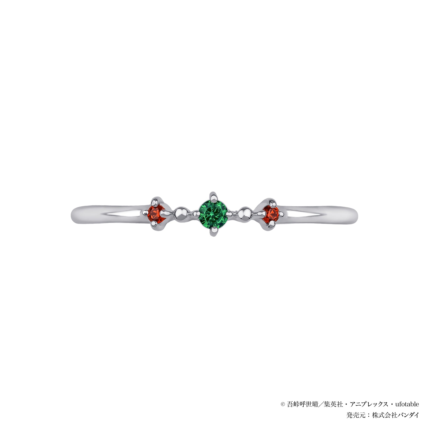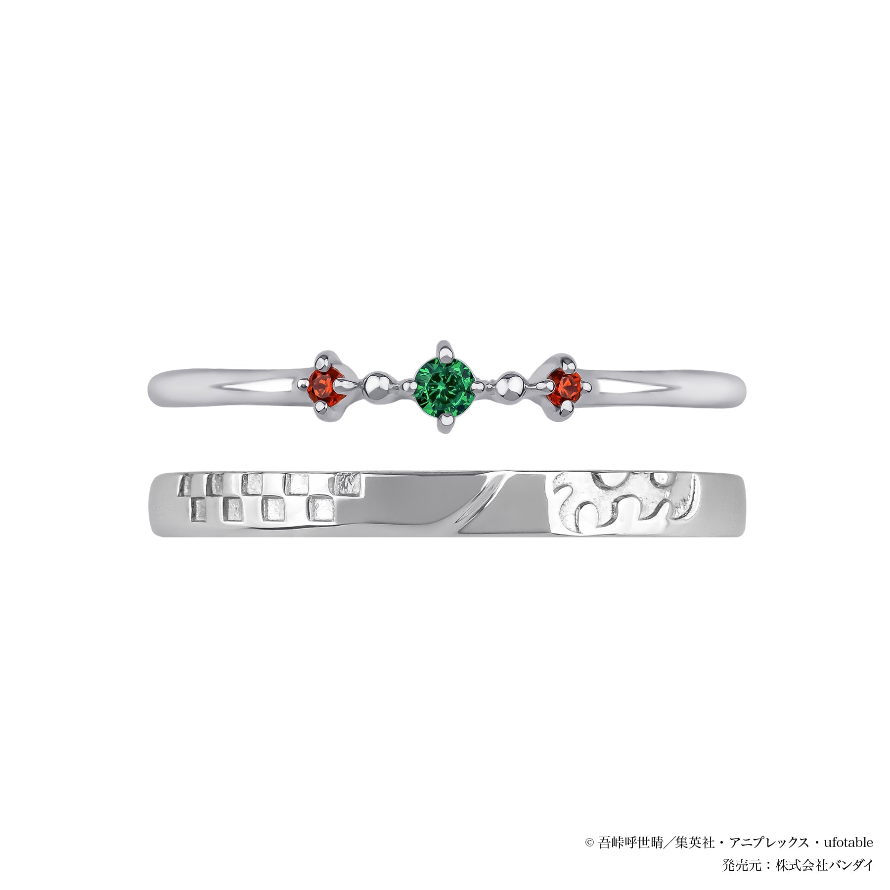 石付きのリングはセンターに炭治郎をイメージした緑のストーンをセッティングし、サイドには「ヒノカミ神楽」や炭治郎の瞳をイメージした赤いストーンを添えています。地金のリングには羽織の市松模様と、額の痣を刻印し、中央に日輪刀を思わせるデザインを施しました。不屈の精神で戦う炭治郎の姿と、時を越えて受け継がれる不滅の想いを形にしたデザインで、誰でもデイリーに着けやすいジュエリーに仕上げています。