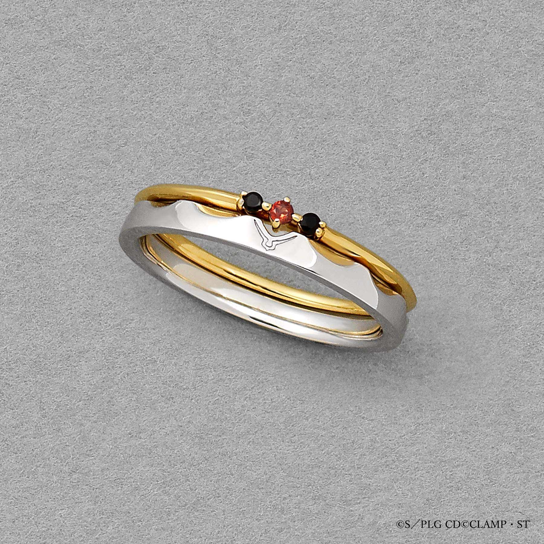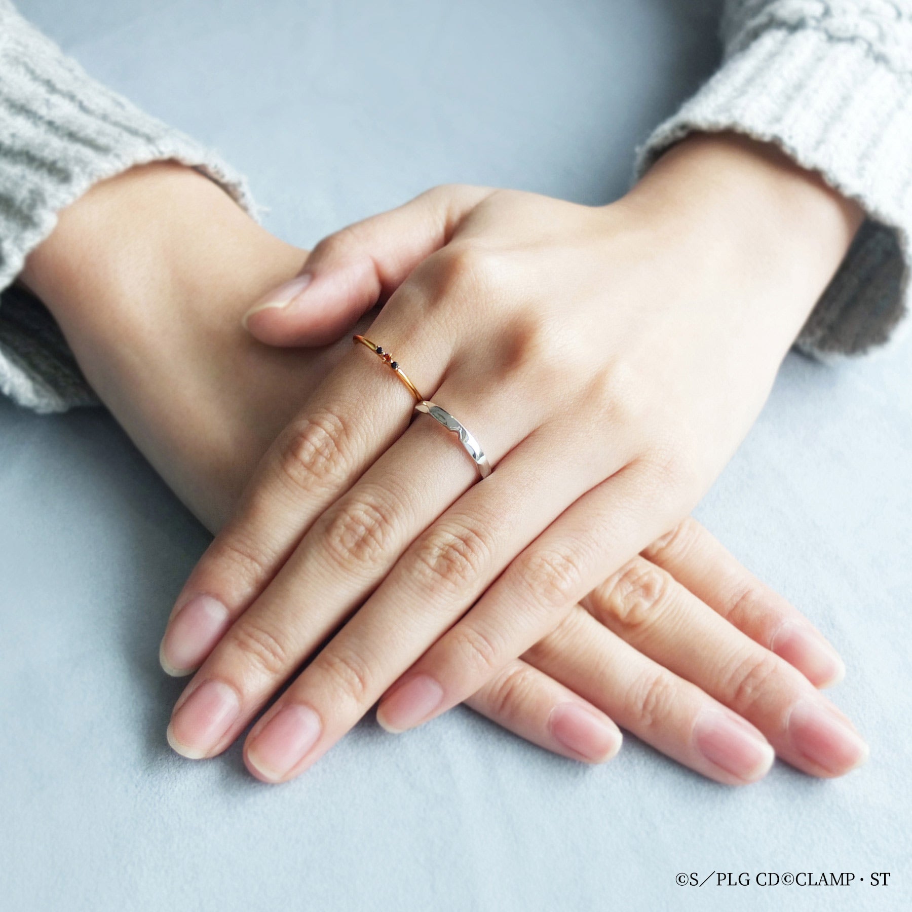 ルルーシュらしさを散りばめた華奢なリングの2本セット。シャープな印象のゴールドカラーのリングは、ルルーシュの覚醒した瞳をガーネットで、衣装や髪の色をオニキスで彩りました。シルバーカラーのリングにはギアスマークを刻み、全体の形でゼロの衣装を表現しています。2本が組み合わさることでより一層ルルーシュらしさが際立つデザインに仕上がりました。