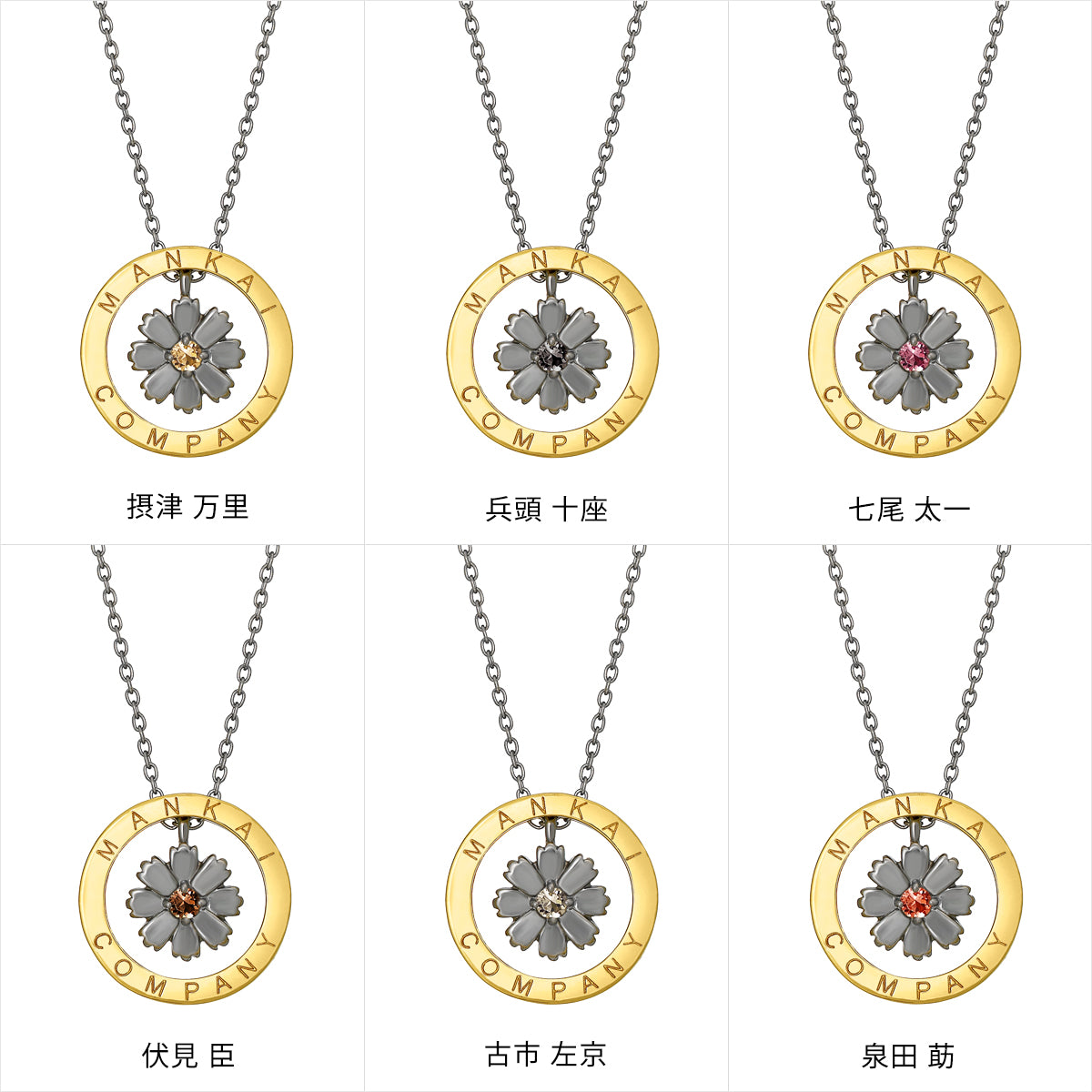 MANKAI COMPANYの刻印が入ったサークルと、秋組の劇団員をイメージしたコスモスモチーフで、個性豊かな劇団員がチームとしてまとまる様子をデザインしたネックレス。