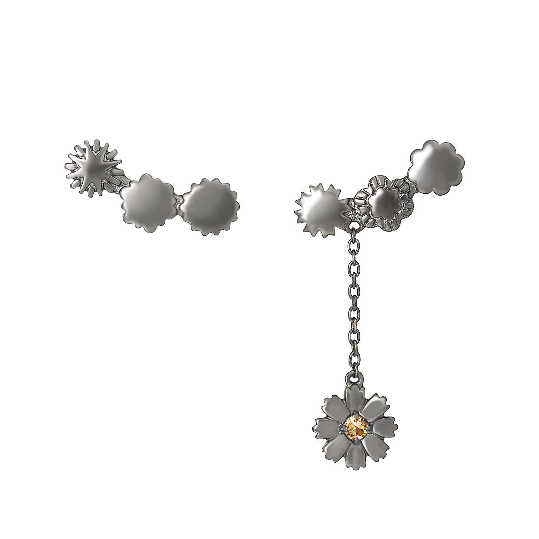 アシンメトリーなデザインがトレンド感を高め、さりげなく揺れるコスモスがおしゃれなピアスです。