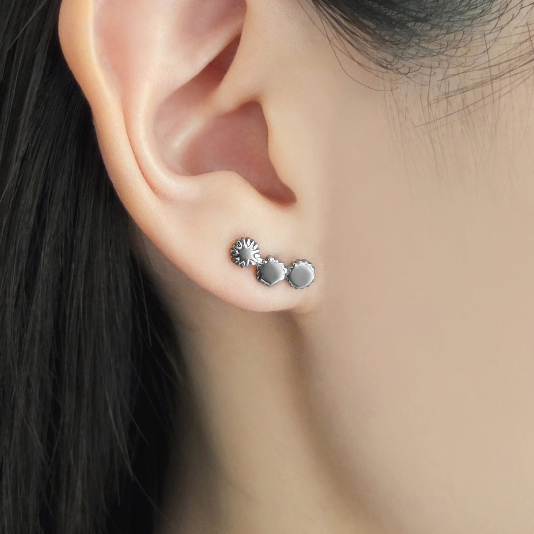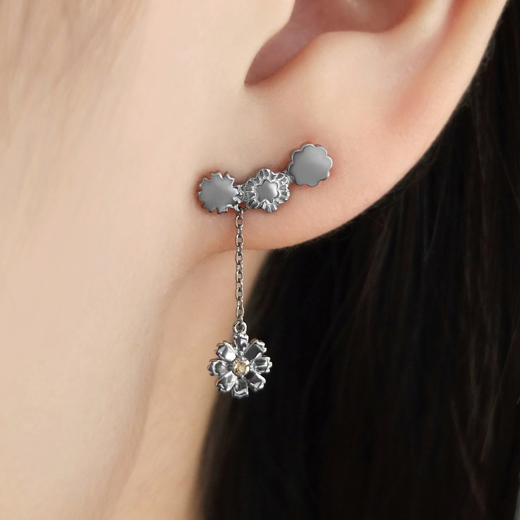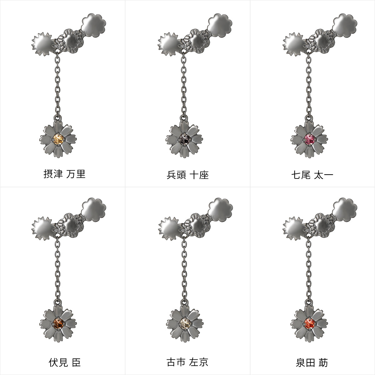 各劇団員のモチーフフラワーロゴをシルエットにして並べることでユニットを表したピアス。