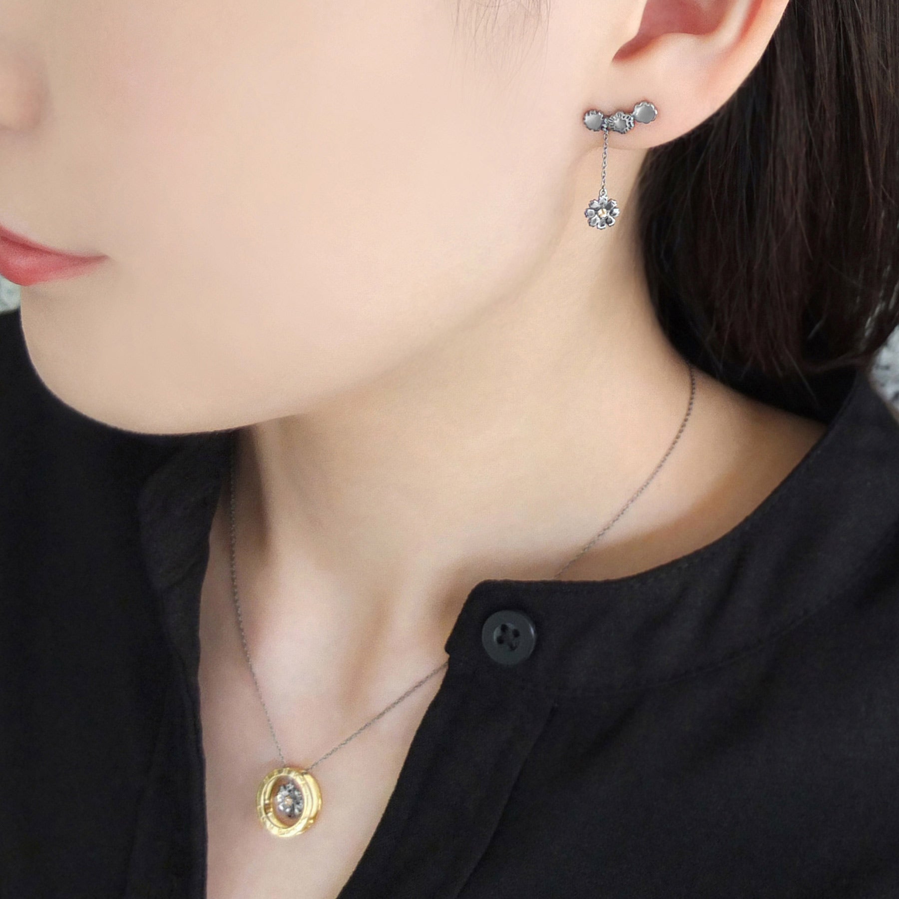 素材 SV925ブラックロジウムコーティング、K10イエローゴールド/ブラックロジウムコーティング(ポスト部分)、K10ホワイトゴールド(キャッチ部分)、スワロフスキー・クリスタル |