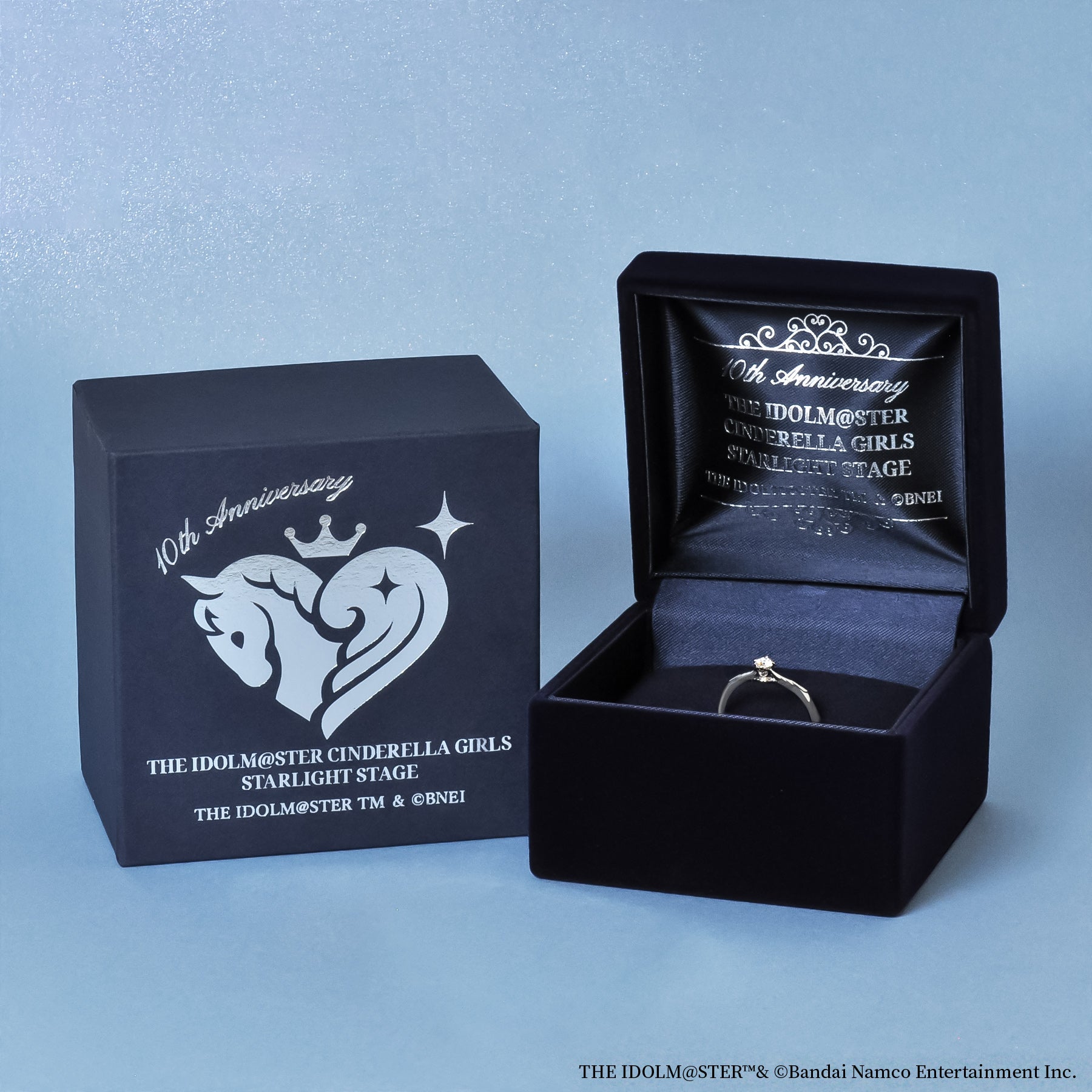ペガサスマークからインスパイアされたハートと羽をメインに、「アイドルマスター シンデレラガールズ」を象徴するような魅力的なデザインに仕上げました。センターには地球上で最も輝くと言われる「モアサナイト」をセッティングし、何よりも輝きを放つアイドル達と、何年経っても変わらないプロデューサーの絆を表しています。また、石座側面にはプラチナ900はサファイヤ、シルバーはサファイヤカラーのキュービックジルコニアをセッティングしました。アームにはペガサスの羽をデザイン。プロデューサーによって成長し、大きく飛躍していくアイドル達の姿をイメージしています。繊細かつ立体的なデザインで高級感溢れるリングは、プロデューサーとアイドル達が歩んできた軌跡を象徴しているのはもちろん、プロデューサーが普段使いでおしゃれに着けて楽しむこともできるアイテムです。