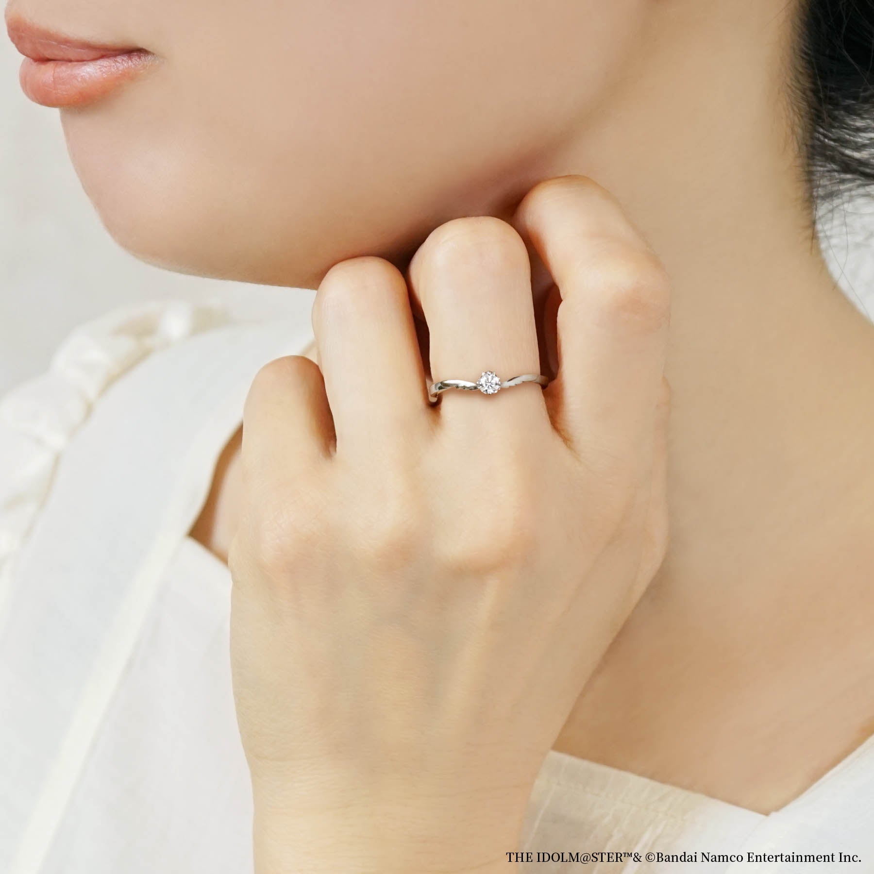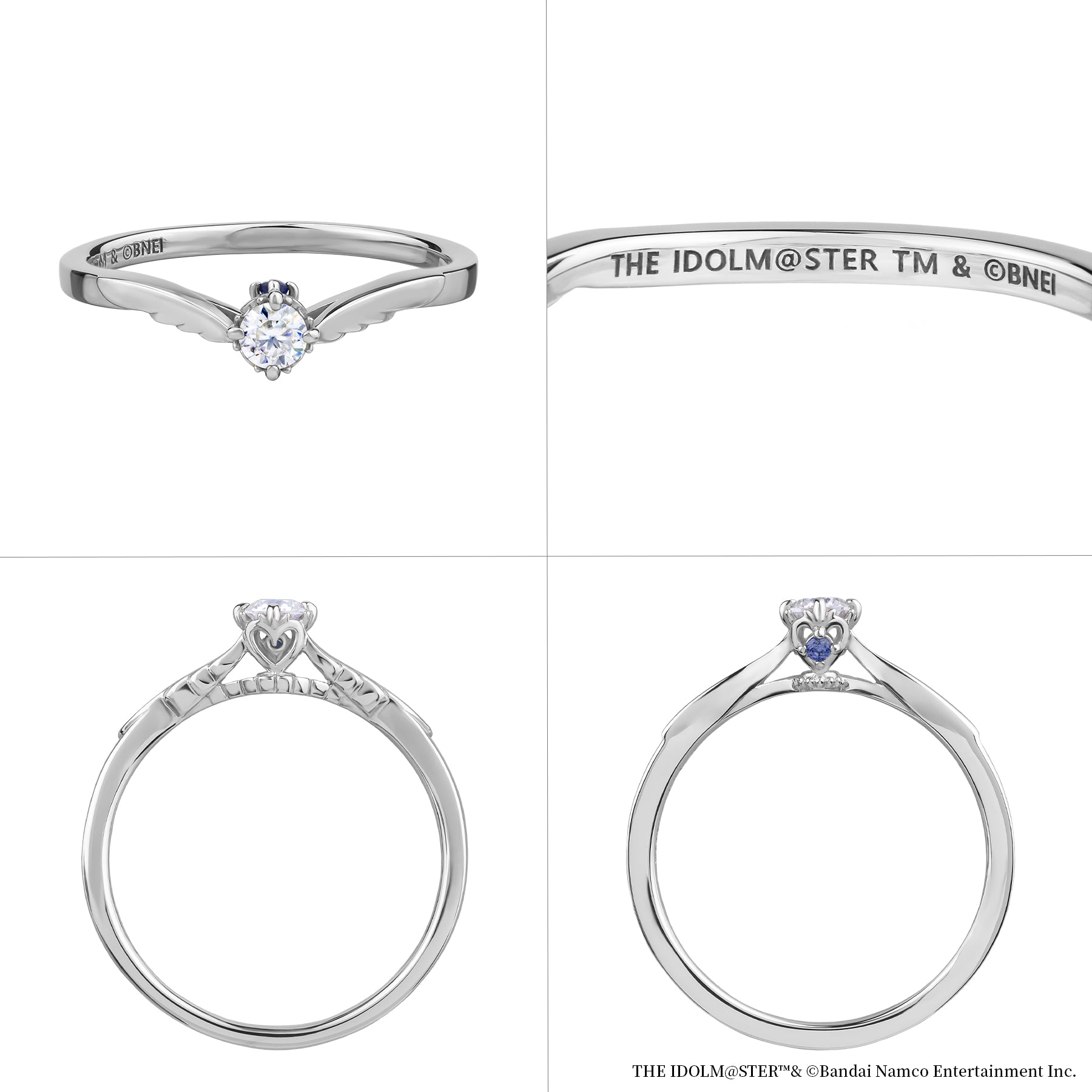 また、石座側面には誕生日のお祝いとして9月の誕生石(プラチナ900はサファイヤ、シルバーはサファイヤカラーのキュービックジルコニア)をセッティングしました。石座の下に施した地金の粒や放射線状のラインはステージライトを表しています。アームにはペガサスの羽をデザイン。プロデューサーによって成長し、大きく飛躍していくアイドル達の姿をイメージしています。繊細かつ立体的なデザインで高級感溢れるアニバーサリーリングは、プロデューサーとアイドル達が歩んできた10年を記念するのはもちろん、プロデューサーが普段使いでおしゃれに着けて楽しむこともできるアイテムです。